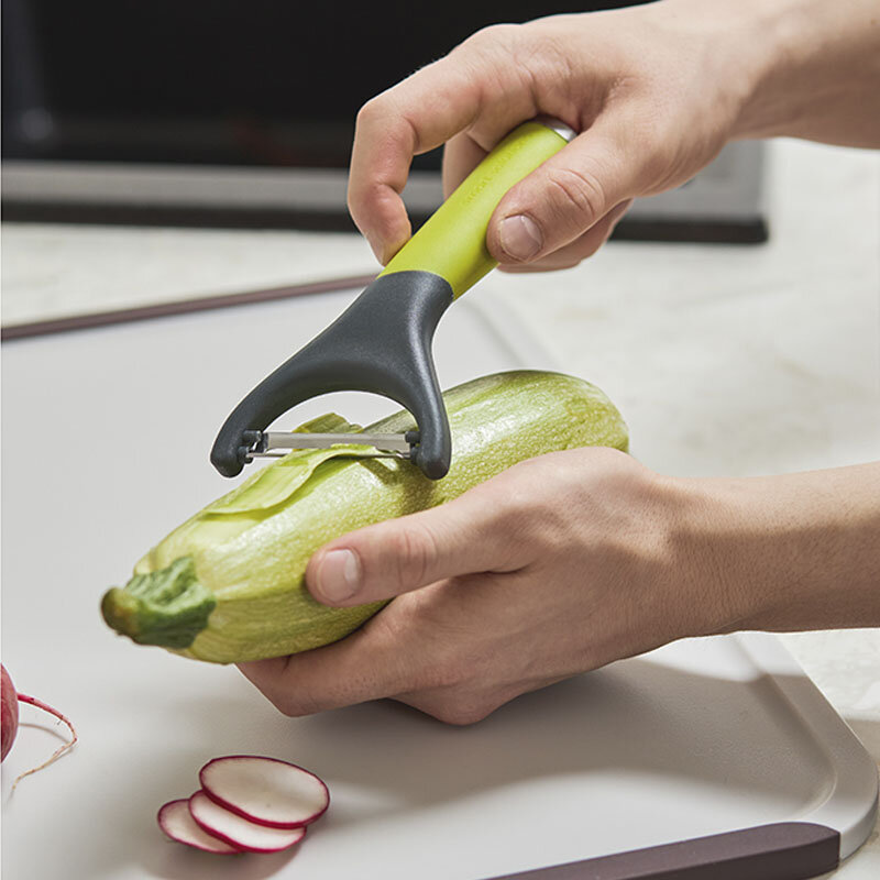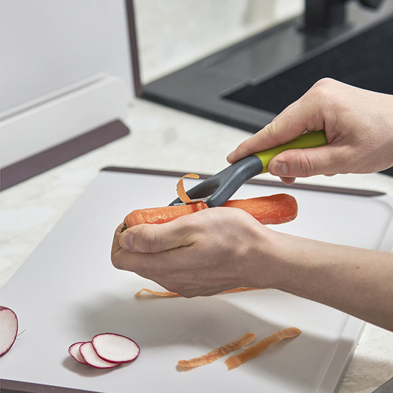 - Уникальный дизайн позволяет брать нож в разных позициях и чистить в направлении как от себя, так и к себе.