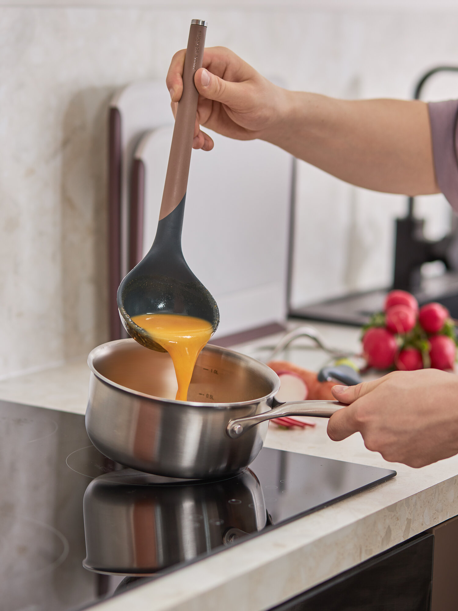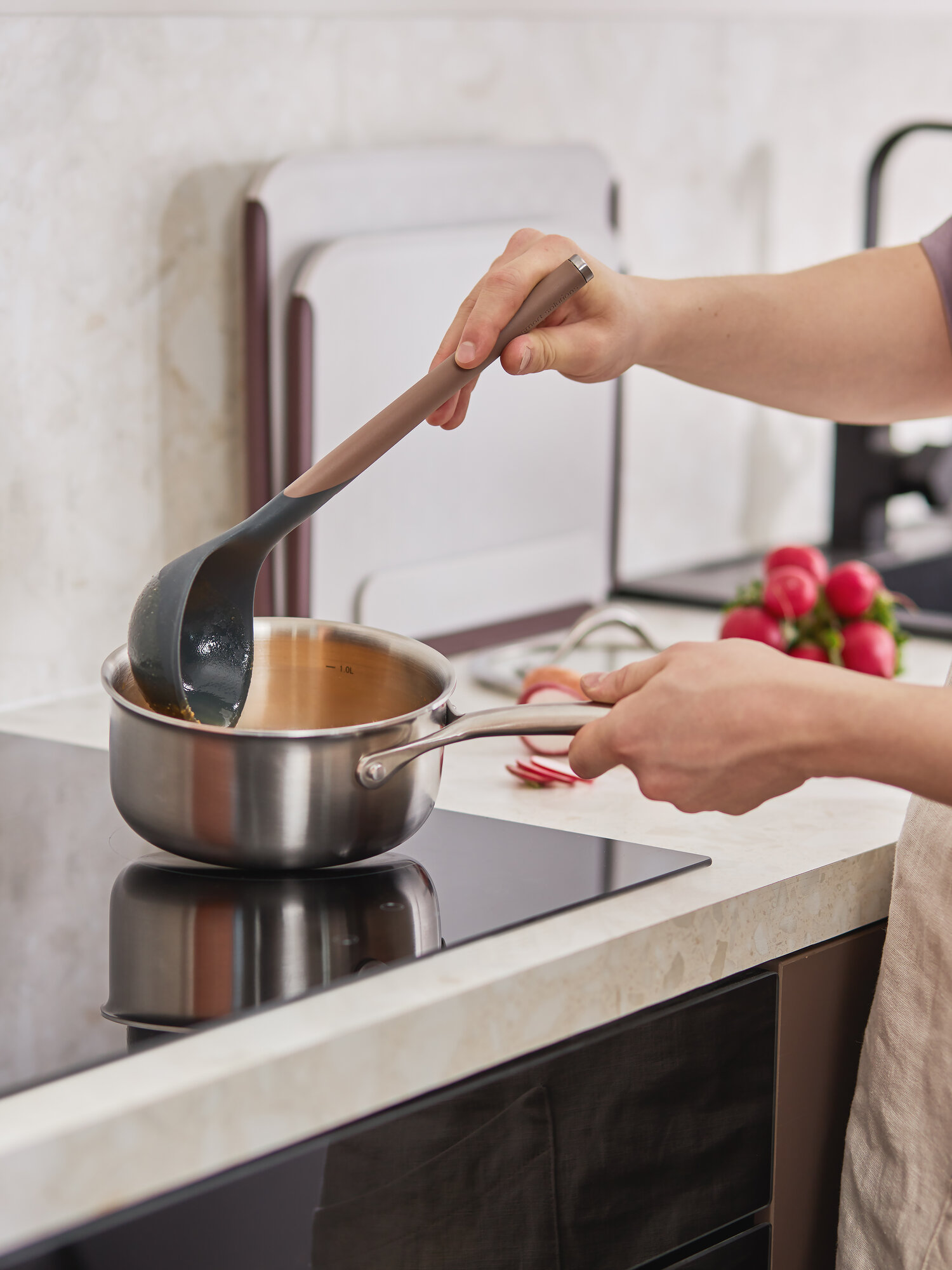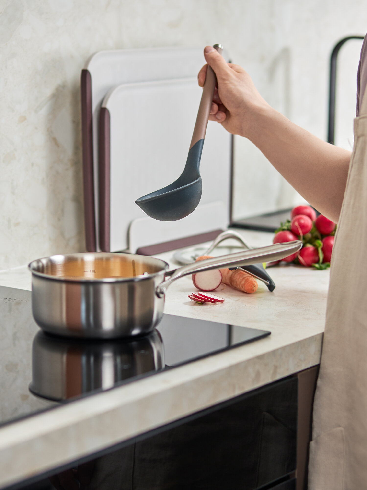 Коллекция кухонных инструментов SmartChef объединяет в себе лаконичный дизайн, высокую функциональность и инновационные материалы, чтобы приготовление блюд доставляло удовольствие, а пространство кухни выглядело стильным и организованным. Поверхности софт-тач дарят приятные тактильные ощущения и улучшают эргономику продуктов, делая их более удобными в использовании. Главное все предметы специально разработаны для использования с посудой, имеющей антипригарное покрытие.
