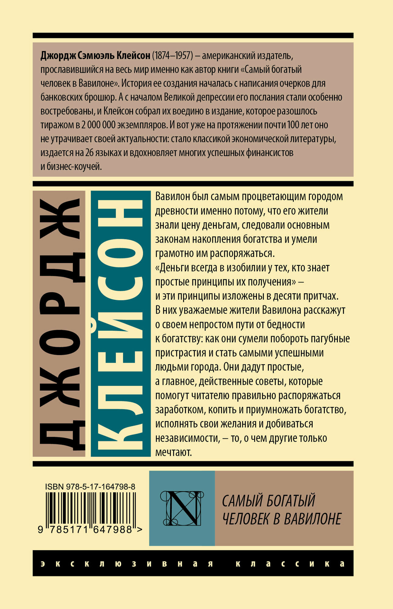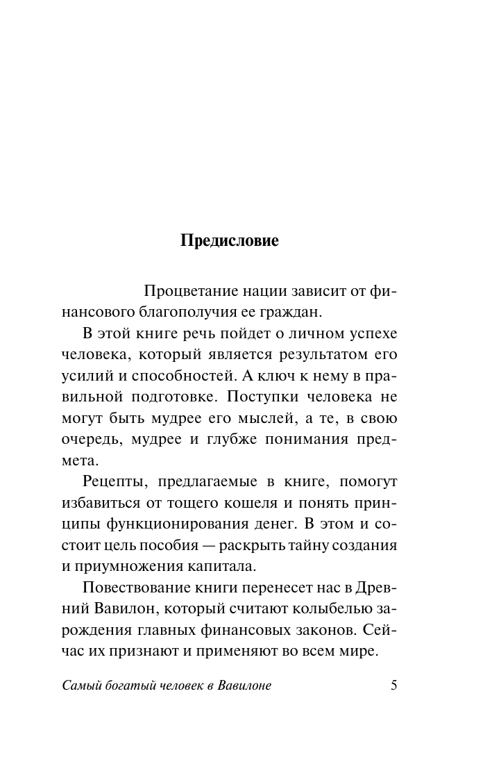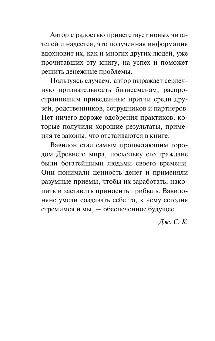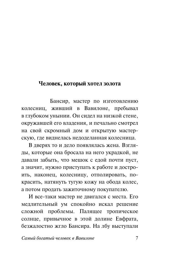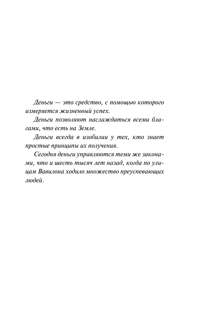 Вавилон был самым процветающим городом древности именно потому, что его жители знали цену деньгам, следовали основным принципам накопления богатства и умели грамотно им распоряжаться. «Деньги всегда в изобилии у тех, кто знает простые принципы их получения» — и эти принципы изложены в десяти притчах. В них уважаемые жители Вавилона расскажут о своем непростом пути от бедности к богатству: как они сумели побороть пагубные пристрастия и стать самыми успешными людьми города. Они дадут простые, а главное, действенные советы, которые помогут читателю правильно распоряжаться заработком, копить и приумножать богатство, исполнять свои желания и добиваться независимости — то, о чем другие только мечтают.