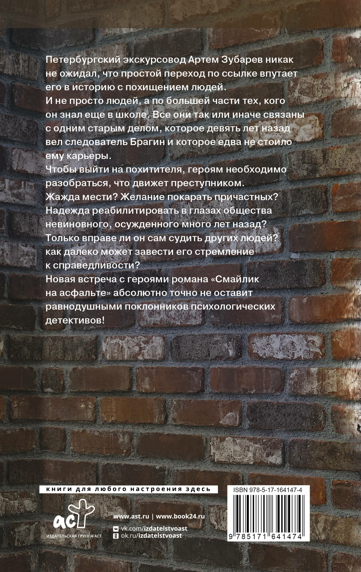 Петербургский экскурсовод Артем Зубарев никак не ожидал, что простой переход по ссылке впутает его в историю с похищением людей. И не просто людей, а по большей части тех, кого он знал еще в школе. Все они так или иначе связаны с одним старым делом, которое девять лет назад вел следователь Брагин и которое едва не стоило ему карьеры. Чтобы выйти на похитителя, героям необходимо разобраться, что движет преступником. Жажда мести? Желание покарать причастных? Надежда реабилитировать в глазах общества невиновного, осужденного много лет назад? Только вправе ли он сам судить других людей? И как далеко может завести его стремление к справедливости? Новая встреча с героями романа «Смайлик на асфальте» абсолютно точно не оставит равнодушными поклонников психологических детективов!