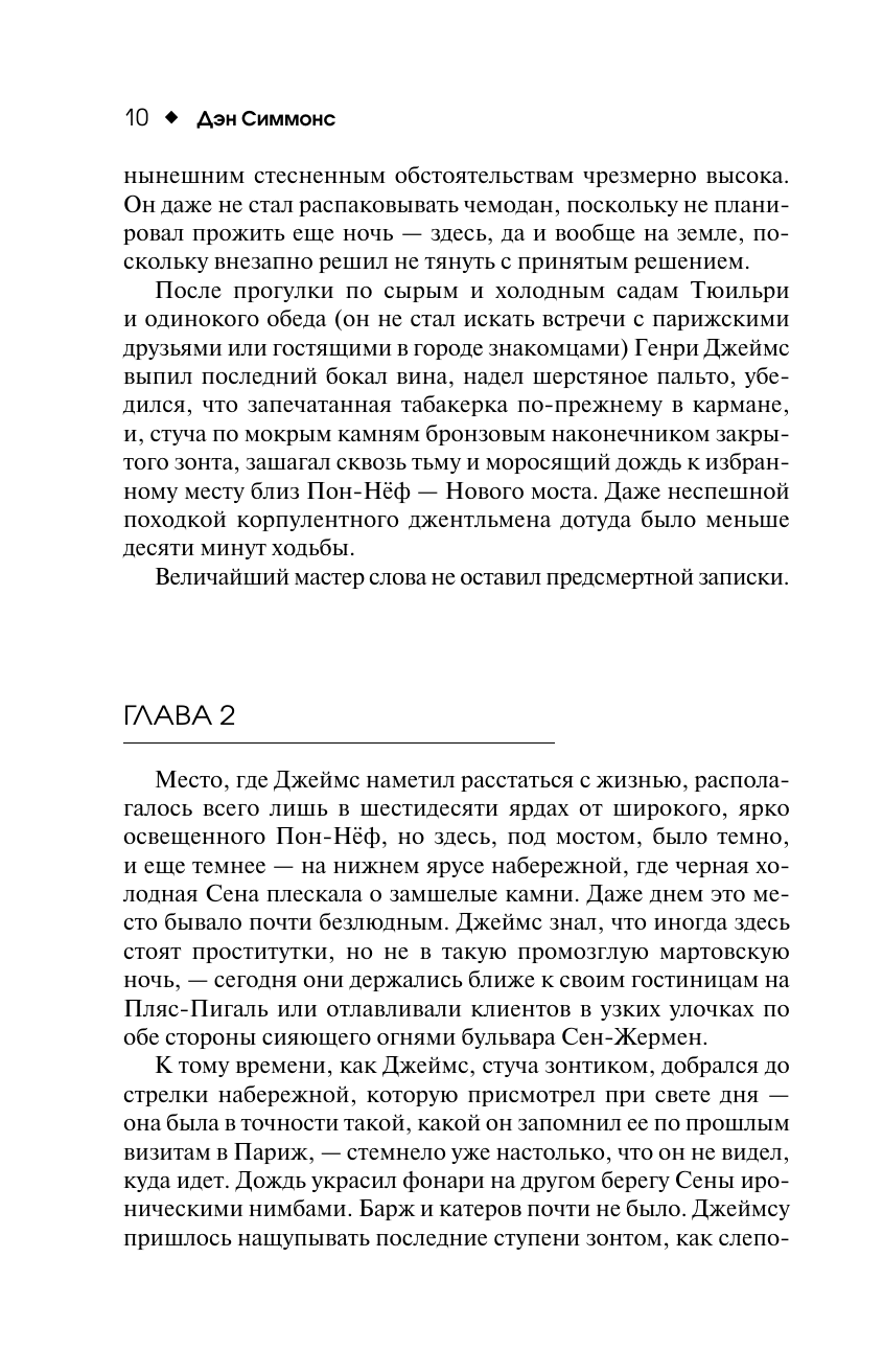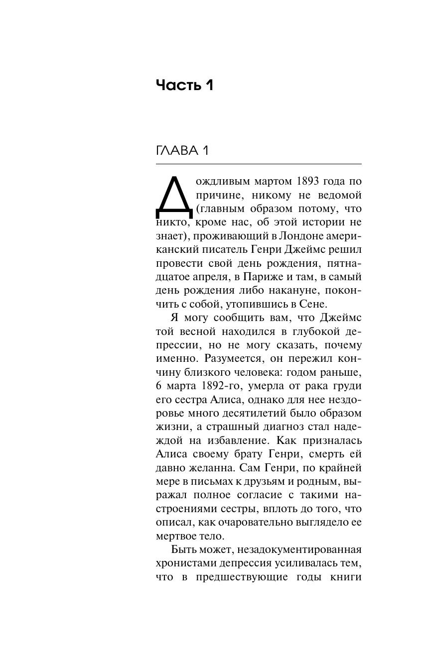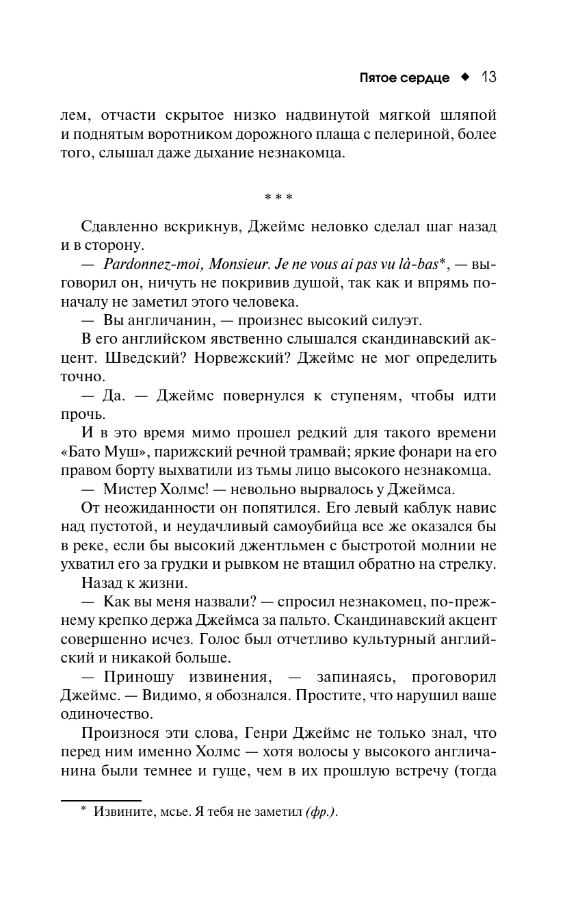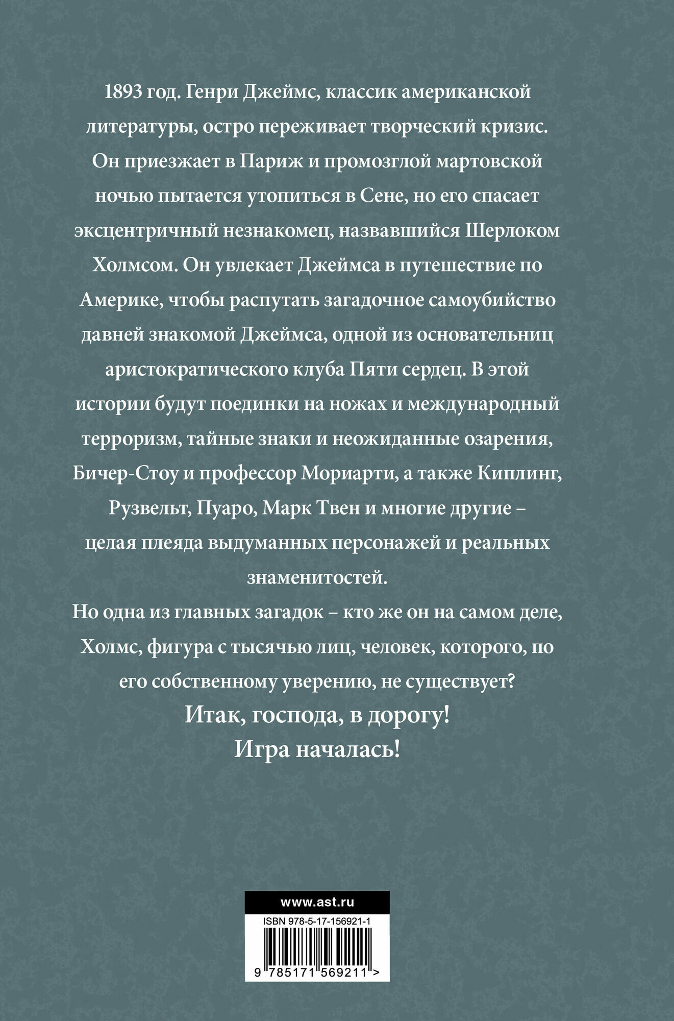 1893 год. Генри Джеймс, классик американской литературы, остро переживает творческий кризис. Он приезжает в Париж и промозглой мартовской ночью пытается утопиться в Сене, но его спасает эксцентричный незнакомец, назвавшийся Шерлоком Холмсом. Он увлекает Джеймса в путешествие по Америке, чтобы распутать загадочное самоубийство давней знакомой Джеймса, одной из основательниц аристократического клуба Пяти сердец. В этой истории будут поединки на ножах и международный терроризм, тайные знаки и неожиданные озарения, Бичер-Стоу и профессор Мориарти, а также Киплинг, Рузвельт, Пуаро, Марк Твен и многие другие – целая плеяда выдуманных персонажей и реальных знаменитостей. Но одна из главных загадок – кто же он на самом деле, Холмс, фигура с тысячью лиц, человек, которого, по его собственному уверению, не существует? Итак, господа, в дорогу! Игра началась!