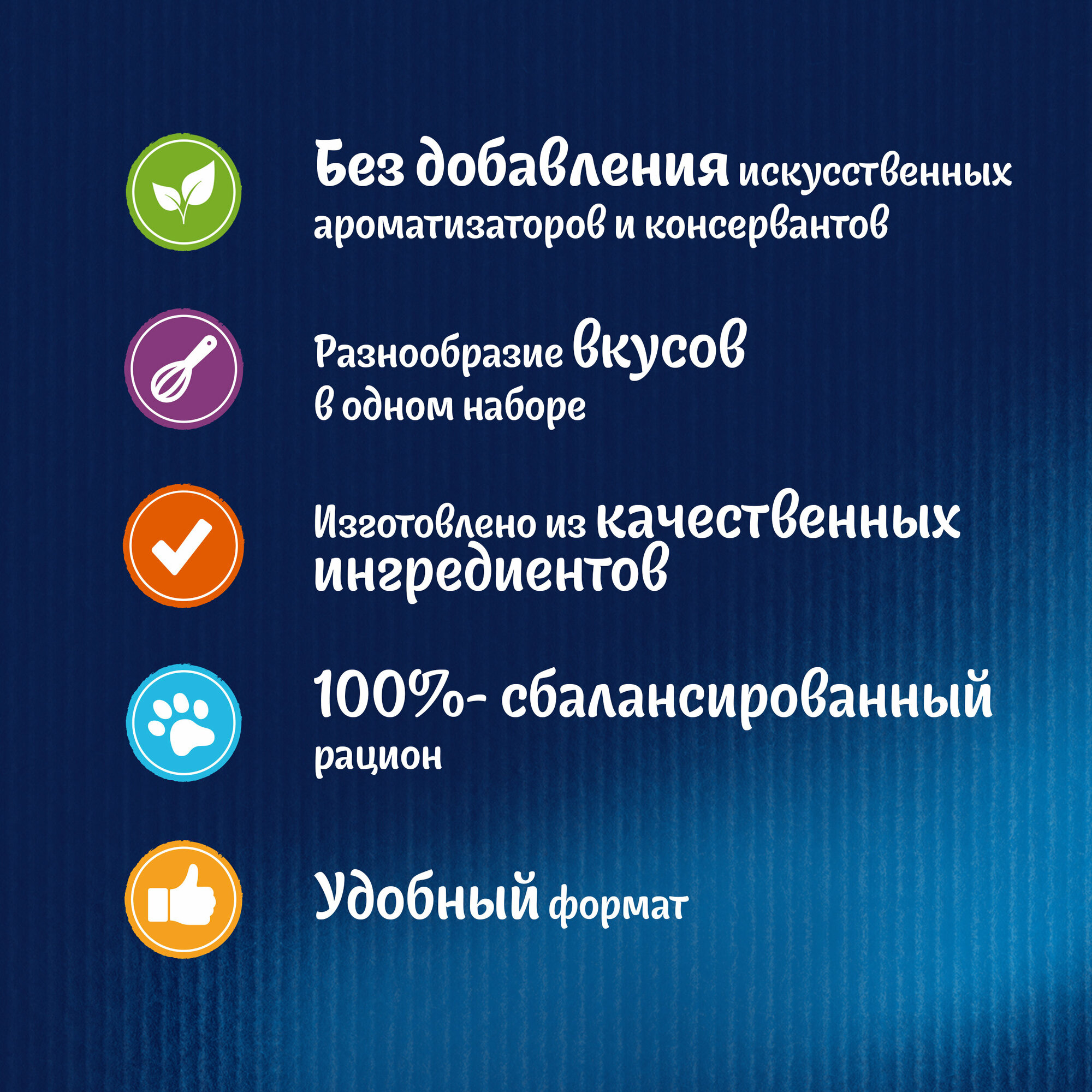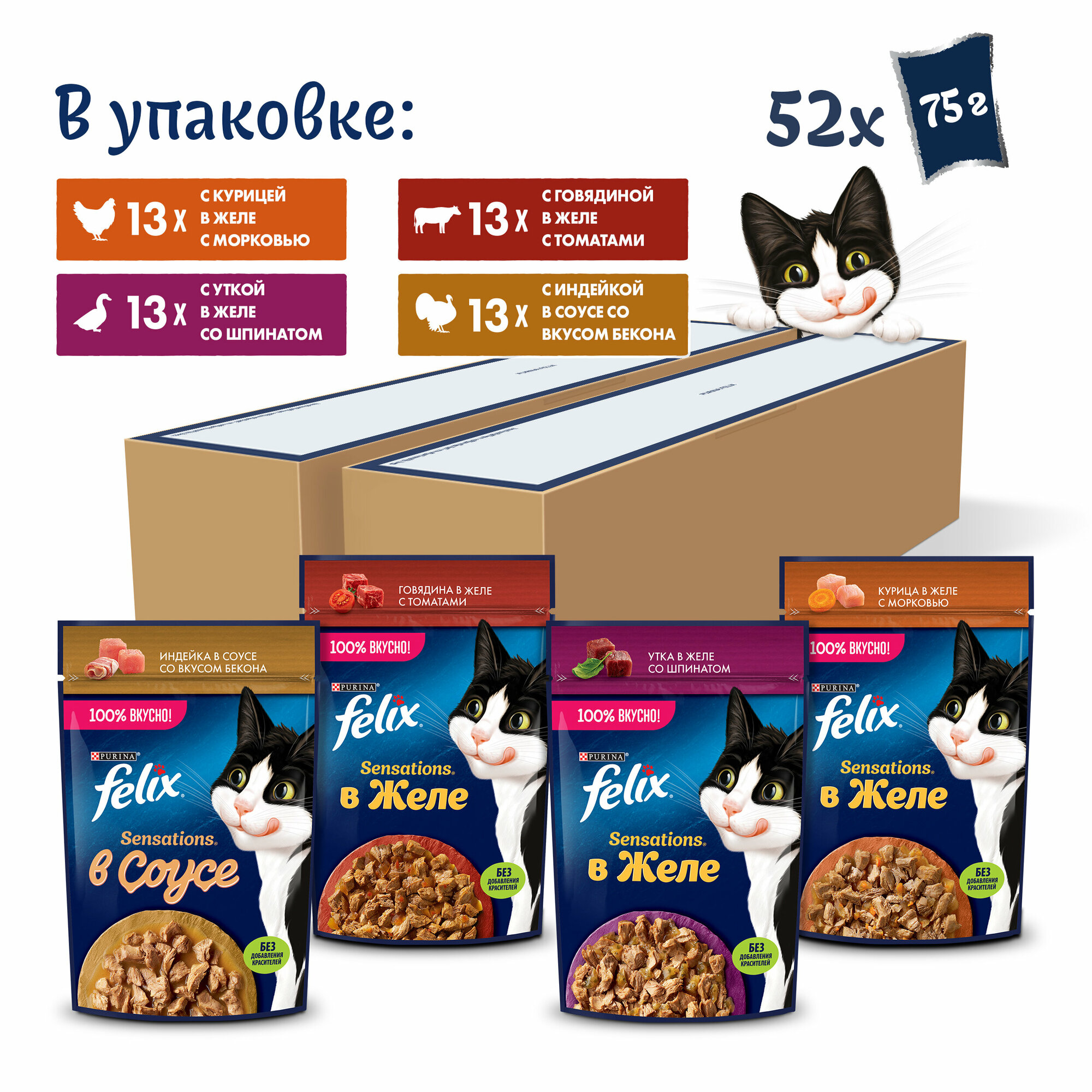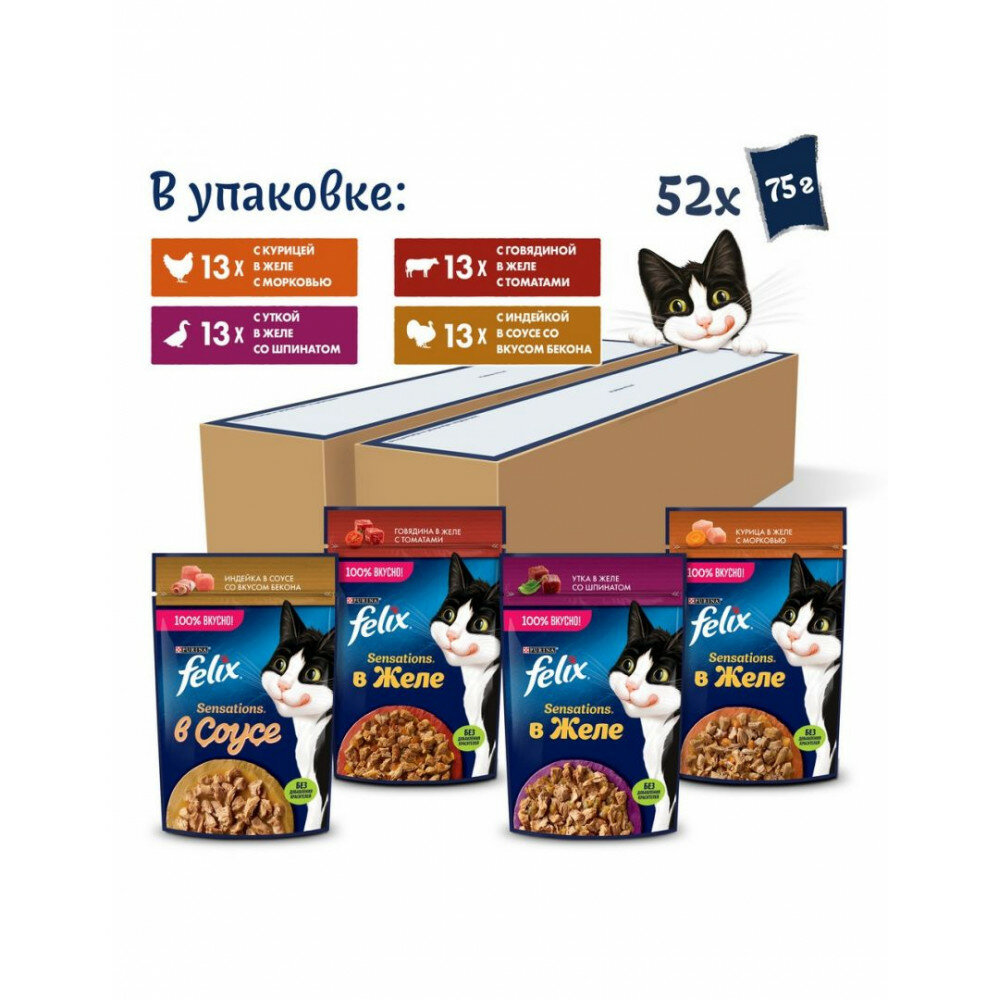 Мультипак Влажный корм Паучи Феликс Сенсейшенс для взрослых кошек с курицей и морковью, говядиной и томатами, уткой со шпинатом в желе и индейкой со вкусом бекона в соусе (цена за упаковку) - Влажный корм Felix Sensations для кошек с курицей и морковью, с говядиной и томатами, с уткой со шпинатом в желе и с индейкой со вкусом бекона в соусе 75 г х 52 шт. Чтобы Ваш питомец получил богатейшую палитру ощущений вкуса и аромата, эксперты Purina создали влажный корм для взрослых кошек Felix «Sensations». Теперь любимая вкуснятина вашего питомца доступна в супервыгодной упаковке мультипак! Покупая упаковку мультипак с разными вкусами внутри, вы даете вашим питомцам возможность оценить все разнообразие линейки кормов Felix «Sensations». Преимущества упаковки мультипак: • Удобный формат • Экономичность • Разнообразие вкусов • Экологичная упаковка. Влажные корма для кошек Felix, созданные из высококачественных ингредиентов с заботливо приготовленными нежными кусочками в аппетитном соусе подарят Вашему любимцу потрясающие ощущения и оптимальную комбинацию питательных веществ для активной и здоровой жизни.∙ 100% сбалансированный полный рацион ∙ Баланс минералов ∙ Содержит витамины Д и Е ∙ Источник Омега-6 жирных кислот ∙ Без добавления искусственных ароматизаторов, красителей и консервантов состав Курица в желе с морковью: мясо и продукты его переработки (из которых курица 4%), экстракты растительного белка, овощи (2.7% концентрата моркови, что эквивалентно 4% моркови в желе), рыба и продукты ее переработки, минеральные вещества, аминокислоты, загустители, сахара, витамины, красители. Состав Говядина в желе с томатами: мясо и продукты его переработки (из которых говядина 4%), экстракты растительного белка, овощи (2.7% концентрата томатов, эквивалентно 4% томатов в желе), рыба и продукты ее переработки, минеральные вещества, сахара, красители, аминокислоты, загустители, витамины. Состав Утка в желе со шпинатом: мясо и продукты его переработки (из которых утка 4%), экстракты растительного белка, рыба и продукты ее переработки, минеральные вещества, овощи (шпинат), сахара, красители, аминокислоты, загустители, витамины. Состав Индейка в соусе со вкусом бекона: мясо и продукты его переработки (из которых индейка 4%), экстракты растительного белка, рыба и продукты ее переработки, аминокислоты, минеральные вещества, загустители, сахара, витамины, ароматизатор «бекон».