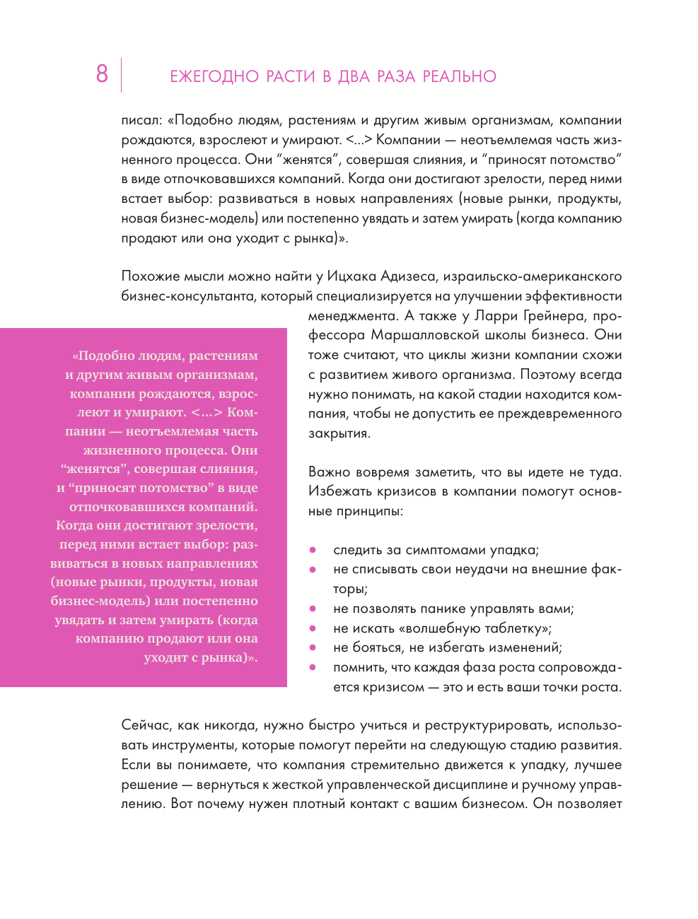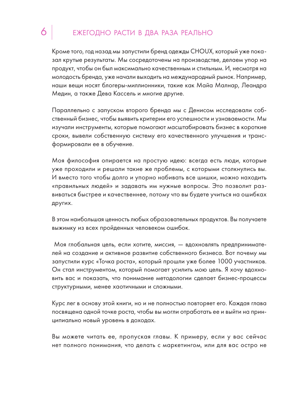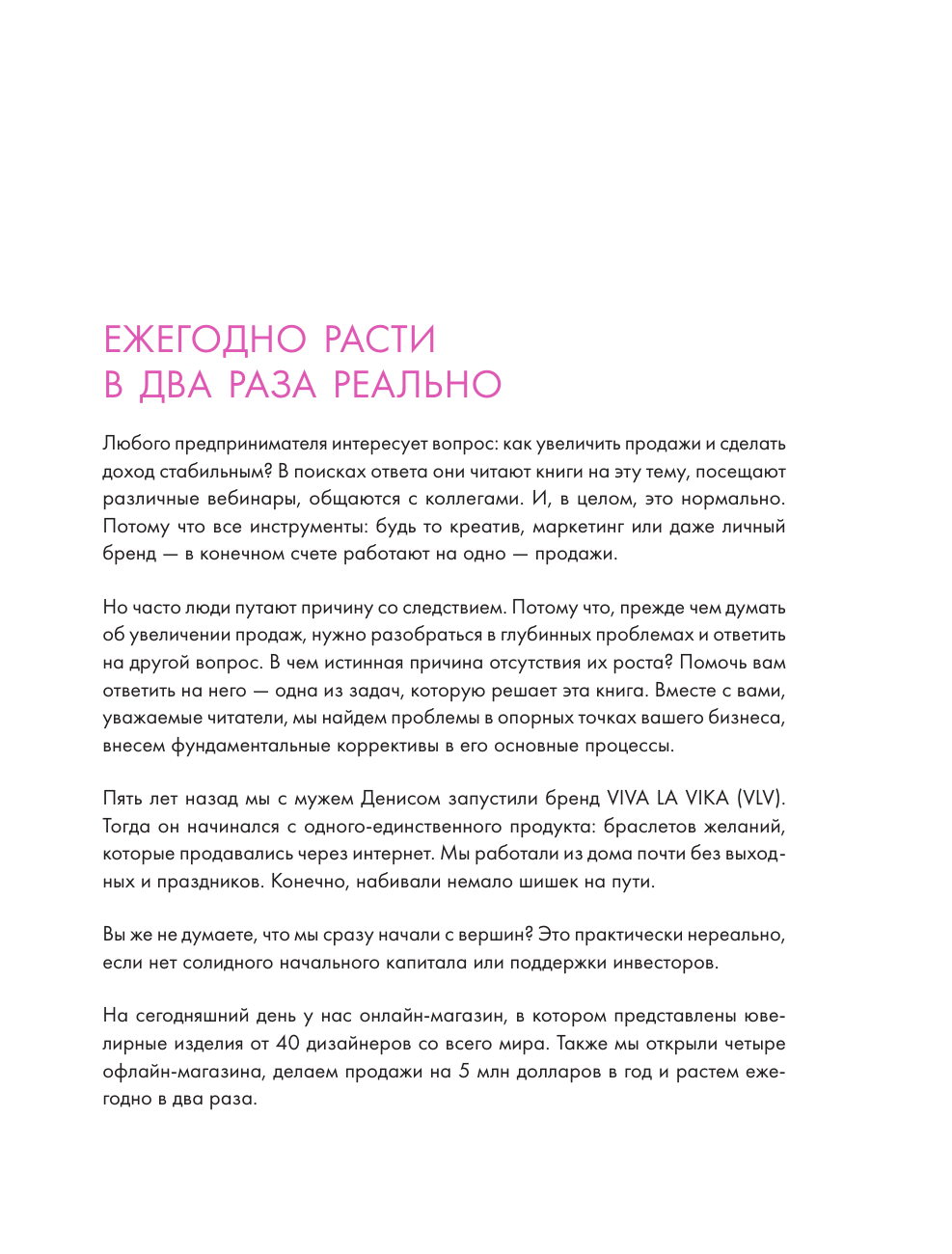Виктория Молдавская - предпринимательца, создатель бренда украшений Viva la Vika и бренда одежды Choux, основательница и спикер авторского бизнес-курса "Точка роста". Бизнес - это живой организм. Подобно нашему телу, все его системы взаимосвязаны, а неполадка в одной из них отражается на общем состоянии. Задача предпринимателя - не только вовремя обнаружить ее, но и превратить в точку роста. В своей книге Виктория Молдавская и приглашенные спикеры помогут найти проблемы в опорных точках вашего бизнеса и внести фундаментальные коррективы в его основные процессы. Каждая глава посвящена одной точке роста, проработка которой поможет выйти на новый уровень развития бизнеса.