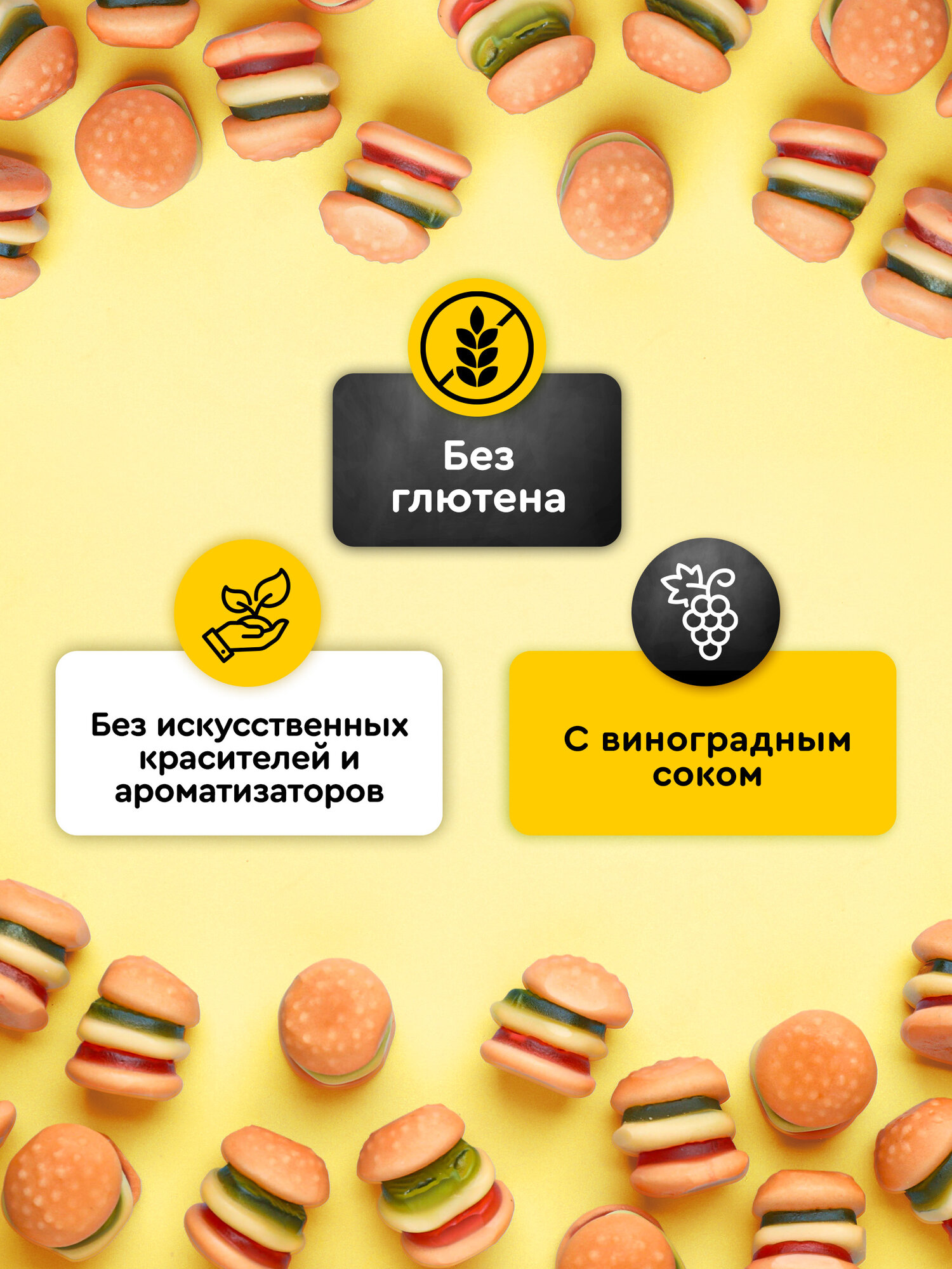 Невозможно устоять! Мармелад в виде бургеров с кисло-сладкими вкусами персика, яблока и клубники поднимает настроение и классно выглядит. Снимайте с мармеладками видео и выкладывайте в соцсети — залетите в тренды! Фруктовая вкусняшка содержит виноградный сок, только натуральные красители и ароматизаторы. Мармелад — это угощение, которое нравится и девочкам, и мальчикам, их папам и мамам, друзьям и учителям. Преподнесите набор мармелада в подарок на первое сентября или выпускной из детского сада сыну или дочке, группе детей, своей подруге — и взрослые, и дети любят кислые и сладкие вкусняшки со вкусом фруктов. В нашем ассортименте есть мармелад разной формы: мармелад в виде мишек, овощей, змеек, тянучки в виде ремней, апельсиновые морковки. Европейский и аргентинский жевательный мармелад содержит желатин, натуральный яблочный и виноградный сок и сахар, поэтому подходит для питания детей старше 3 лет. А еще в нашем мармеладе нет глютена. Сейчас весь мир как бы заново открыл для себя мармелад: подростки снимают хайповые видео с прикольными мармеладками в виде пауков, кислых змей, морковок, бургеров. Устройте мармеладный праздник для друзей — удивите всех своим креативным подходом! Пакетик мармелада — отличный сладкий подарочек мальчику на 23 февраля, девочке на 8 марта, парню или девушке на 14 февраля.