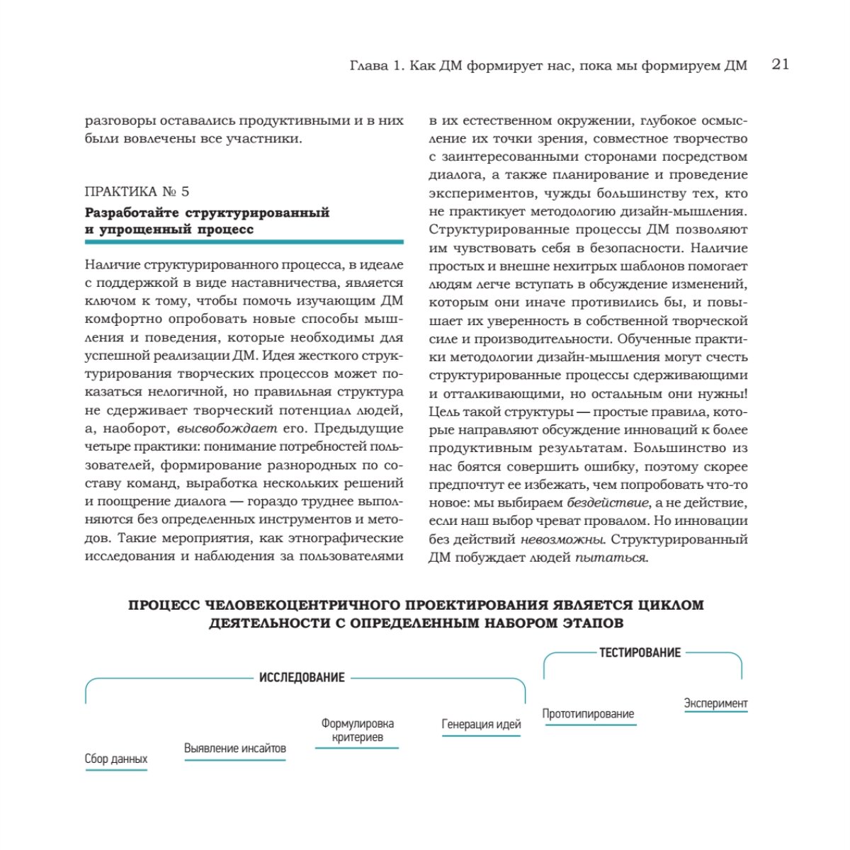 Опираясь на многочисленные исследования, авторы показали, что преобразующий потенциал дизайн-мышления способен оказывать разнообразные позитивные воздействия. В издании представлена роль дизайн-мышления как жизненно важной социальной технологии и приведены доводы в защиту того, как важно понимать разницу между совершением действий при разработке дизайна и проживанием перемены образа мышления и набора навыков.Каждая глава начинается с описания определенной перемены в образе мышления при применении инструментов дизайн-мышления. Рассмотрены научные основы этих перемен, а также показано, почему они совершаются с таким трудом и какую награду мы получаем, когда они происходят. Авторы предлагают свое видение того, как создать серьезный опыт на каждом этапе развития дизайн-мышления, неважно для отдельного сотрудника, команды или для организации. Также описано, как должно измениться мышление и какие компетенции могут быть достигнуты на каждой стадии развития. Вы узнаете, как разные типы личности осваивают процесс трансформации и как в полной мере использовать разнообразие команд.5 причин прочитать эту книгу:Вы поймете, что ценность дизайн-мышления это структурированный подход к работеВы получите подробное описание 6 шагов процесса дизайн-мышленияВы узнаете, какие ключевые навыки нужны сотрудникам на каждом из 6 обозначенных этаповВы сможете понять, как личные предпочтения влияют на процесс дизайн-мышленияВы научитесь корректно оценивать и ускорять свой прогресс в дизайн-мышлении