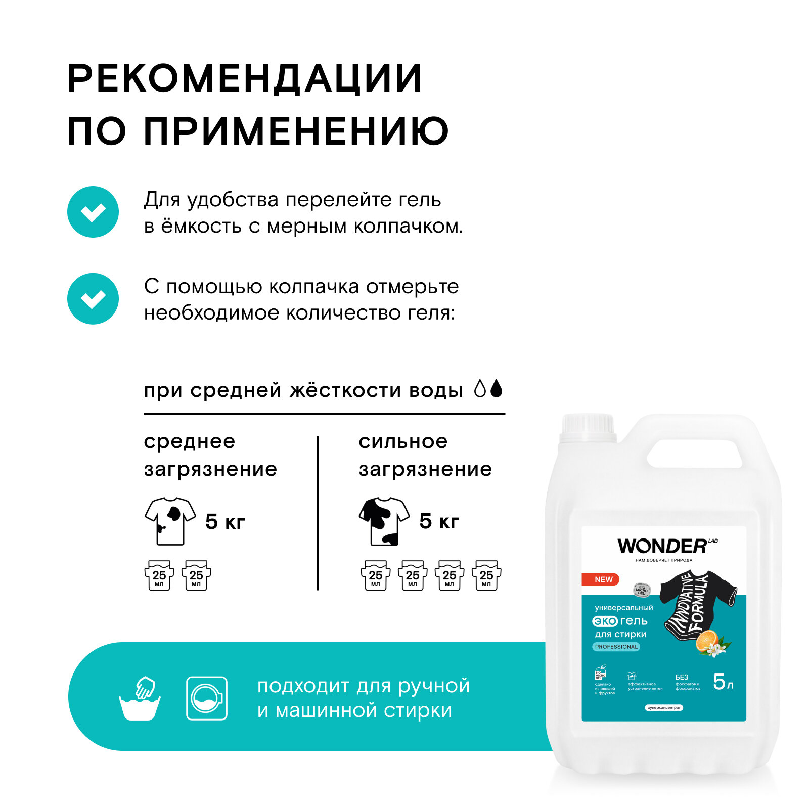 Гель для стирки всех видов тканей WONDER LAB подходит для ручной и машинной стирки в воде любой жесткости. Перед применением встряхнуть. При использовании в стиральной машине гель заливается в отсек для жидких и сыпучих средств. Дозировка в зависимости от степени загрязнения: на стиральную машину вместимостью 5 кг достаточно 50 мл геля при обычных загрязнениях и 100 мл геля при сильных загрязнениях. Гель подходит для стирки детского белья.