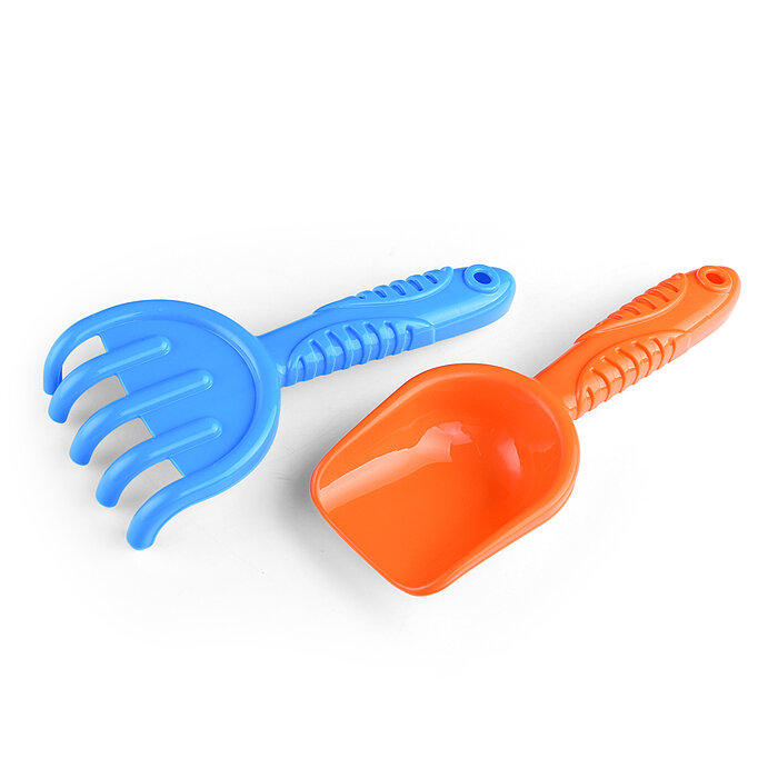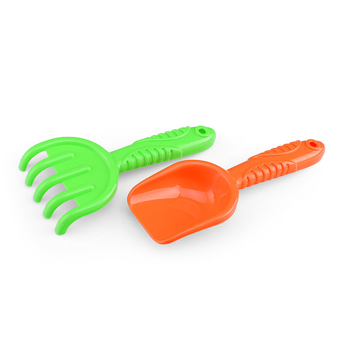 Ручки совка и грабелек украшены рельефом, который вызывает дополнительный интерес у ребенка.
