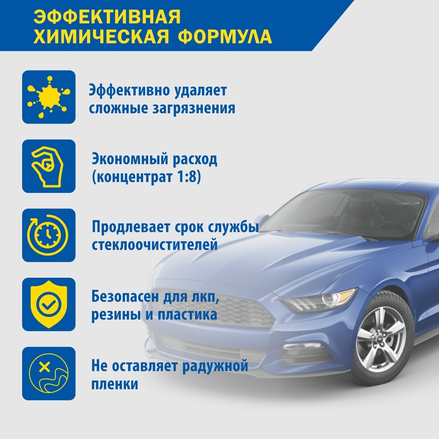Концентрат жидкости стеклоомывателя безопасен для всех типов лакокрасочных покрытий, резины и пластика и продлевает срок службы стеклоочистителей.