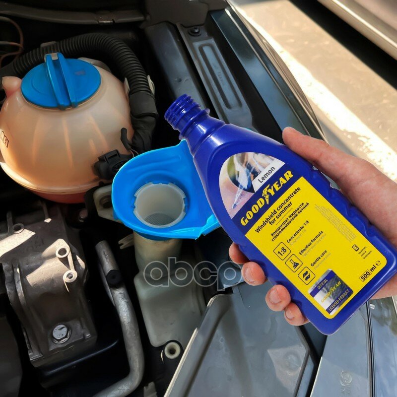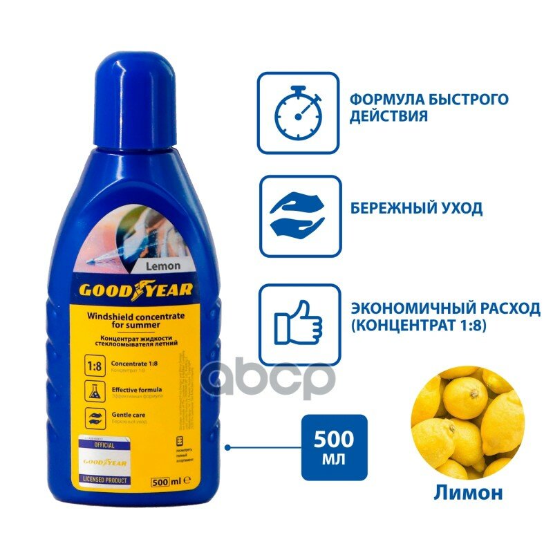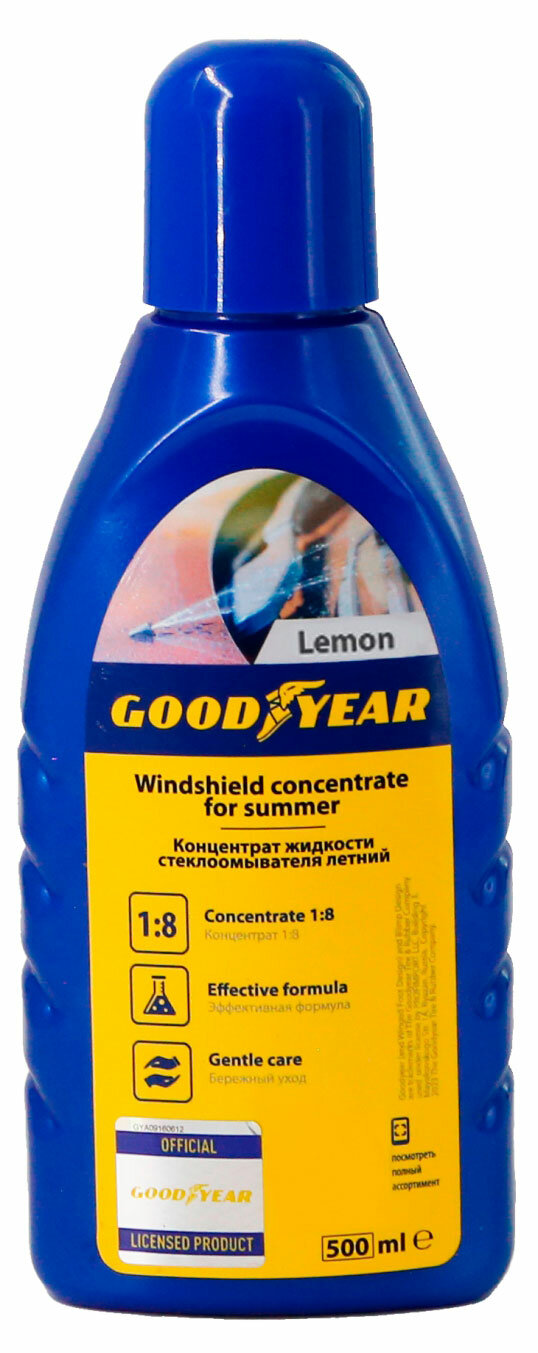 Концентрат жидкости стеклоомывателя (летний) 1:8 Goodyear с ароматом Лимон предназначен для смешивания с водой и использования при температуре выше +5С.