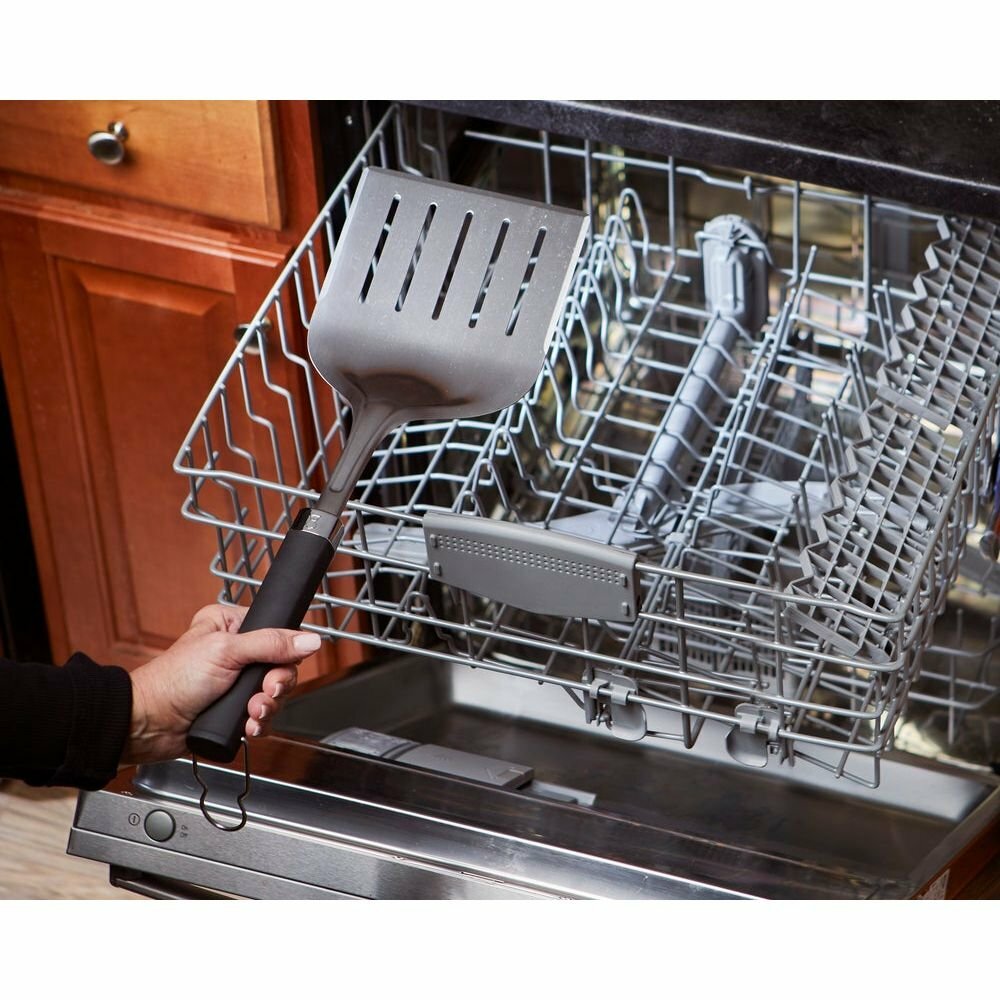 Широкая лопатка Precision для гриляВам нужно поднять и переместить крупные куски мяса или нежное рыбное филе? Легко. Широкая лопатка для гриля имеет заостренные с трех сторон края, позволяющие поднимать продукты с высокой точностью с разных углов. Сверхпрочная конструкция из нержавеющей стали и ручка с покрытием soft-touch обеспечивают полный контроль в работе, а большая площадь лопатки позволяет запросто поднимать крупные куски мяса или нежные продукты.• Конструкция с заостренными с трех сторон краями для удобного подъема и точного переворачивания блюд.• Прочная конструкция из нержавеющей стали.• Ручка с нескользящим покрытием soft-touch.• Простая очистка — можно мыть в посудомоечной машине.• Металлическая петля для подвешивания.• 2 года гарантии.