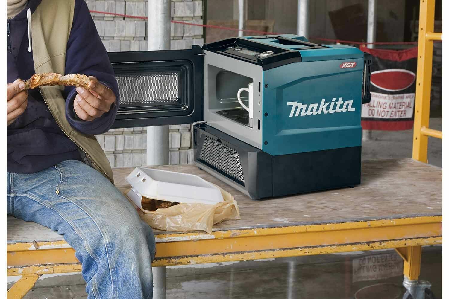 Makita представляет новинку, первая микроволновая печь, которая работает от аккумуляторов XGT. Максимальная мощность микроволн составляет 500 Вт. Полезный объем печи 8 л. На панель выводится вся необходимая информация: мощность, время нагрева (шаг 10 сек), пуск/остановка. Микроволновая печь оснащена внутренней подсветкой и разъемом USB для зарядки гаджетов.