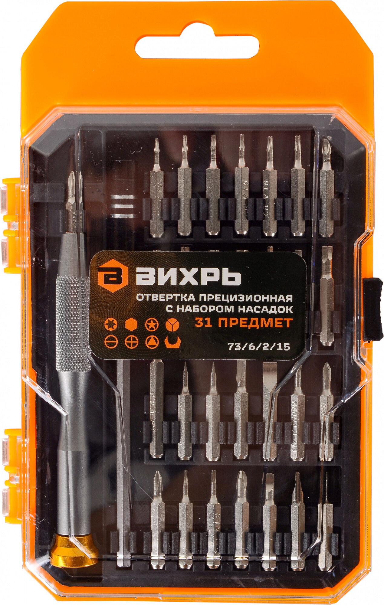 Отвертка Вихрь прецизионная с набором насадок, 31 предмет в кейсе подходит для домашнего и профессионального использования.Предназначена для ремонта телефонов, компьютеров, приёмников и для многих популярных приборов, которые используются в быту.Кейс для удобного и рационального хранения и транспортировки.Инструменты из набора выполнены из качественной хромванадиевой стали, что обеспечивает высокую прочность и долговечность.Удлинитель 60 мм позволяет работать в труднодоступных местах.Металлическая прочная рукоятка.28 сменных бит в комплекте