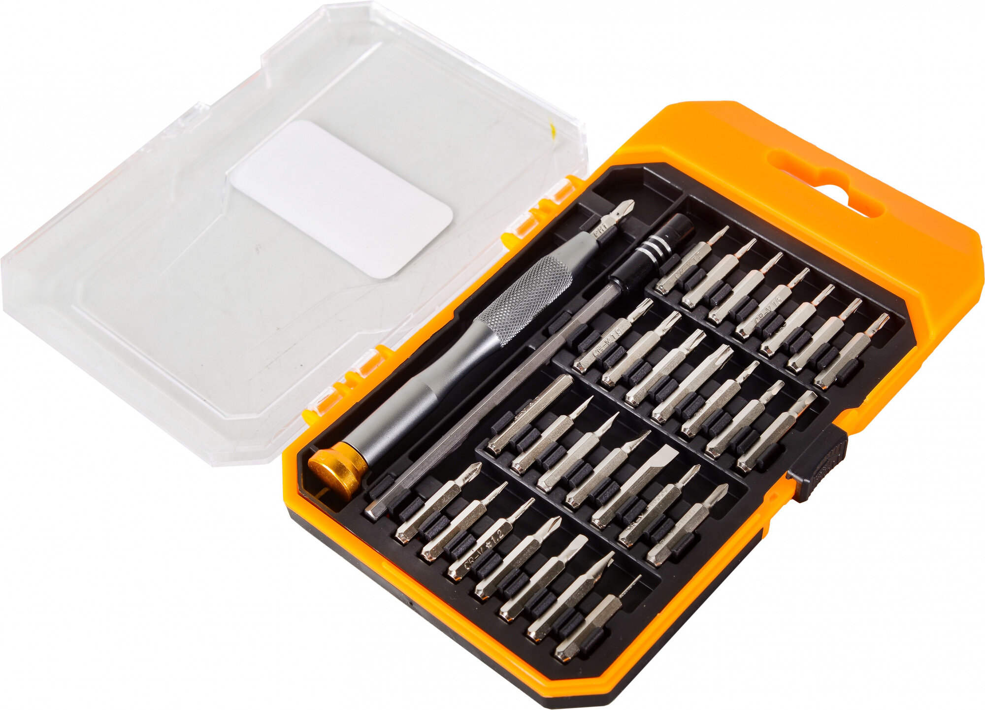 | Комплектация | Рукоятка, Удлинитель, Биты H1.5, H2, H3, H4, Биты PH000, PH00, PH0, PH1, Бита SL4, Биты T2, T3, T4, T5, T6, T7, T8, T9, T10, T15, T20, Бита Tri-Wing 1, Бита двухштырьковая 2.6, Бита трехгранная 2.3, Биты SL1.5, SL2, SL3, SL4, Биты TS0.8, TS1.2, Кейс |