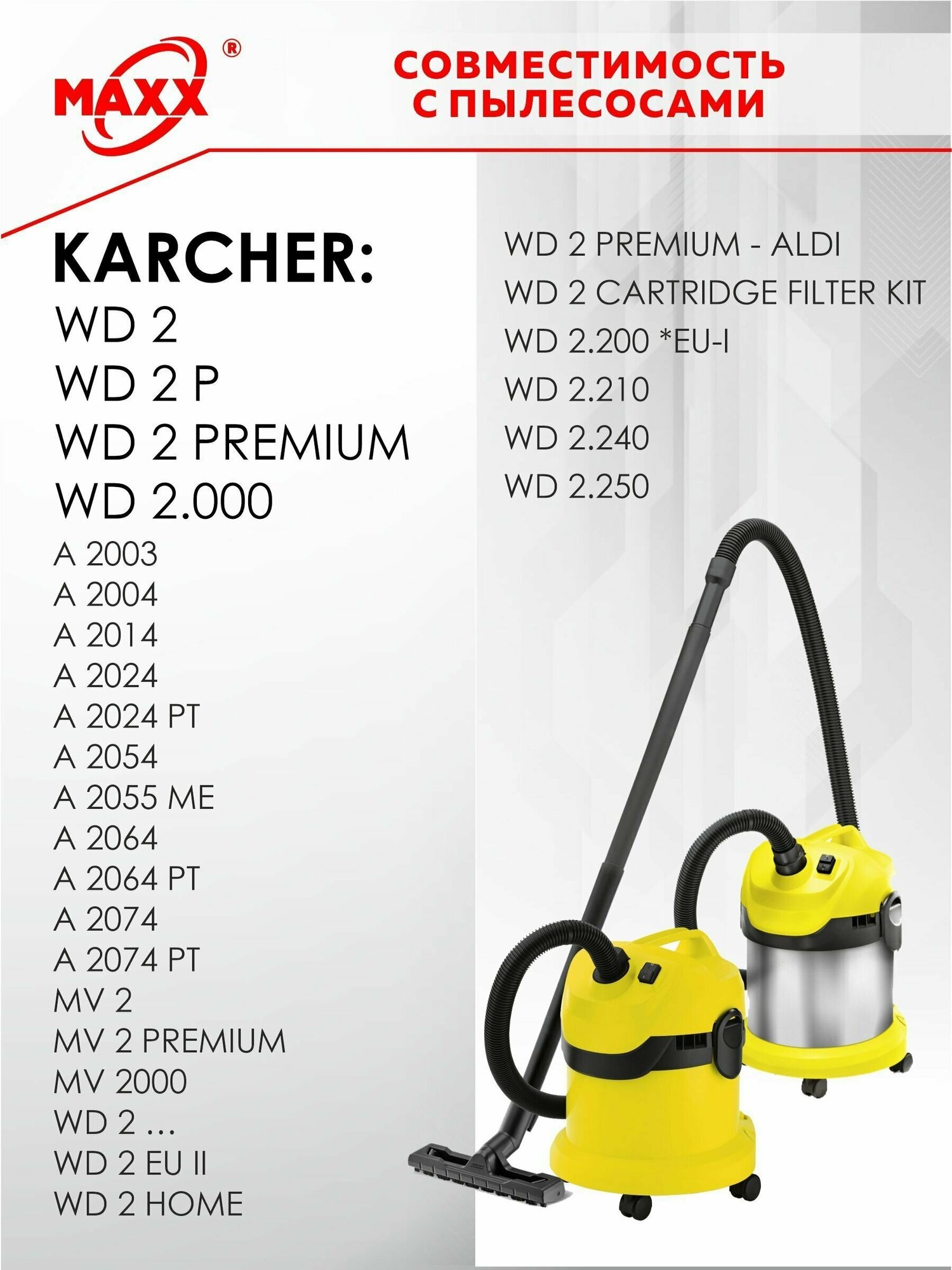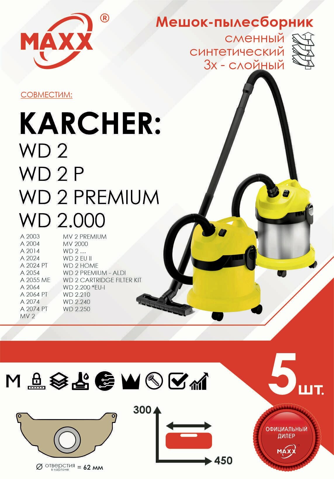 Меняйте мешки вовремя и ваш пылесос будет работать эффективно. Мешки MAXX для пылесоса разработаны для вашего пылесоса. Одноразовые мешки удобны в использовании. Специальный синтетический материал обеспечивает надежное удержание пыли и грязи, делая уборку легкой и быстрой. Универсальные модели подходят для указанных пылесосов. Они отлично справляются с задачей фильтрации загрязнений, устойчивы к важному мусору в отличие от бумажных пылесборников. Одноразовые универсальные фильтр мешки просты в замене: просто выбросьте старый пылесборник, установите новый - и готово. Универсальные одноразовые варианты экономят ваше время. Сменные мешки просты в использовании и обладают повышенной фильтрацией. Это важно для здоровья семьи и персонала. Синтетический фильтр качественно защищает двигатель вашего пылесоса, продлевая его срок службы, благодаря высоким фильтрующим свойствам и высокому содержания мельтблауна. Пыль больше не станет проблемой: мощный мешок для улавливания всех мелких частиц позаботится об этом. Пылесборники легко фиксируются внутри пылесоса, обеспечивая надежную работу без потерь мощности всасывания.Комплектация: 5 одноразовых мешков для пылесоса.Мешки для пылесоса: • KARCHER:A 2000 - 2099 SERIEA 2003A 2004A 2014A 2024A 2024 PTA 2054A 2055 MEA 2064A 2064 PTA 2074A 2074 PTMV 2MV 2 PREMIUMMV 2000WD 2 …WD 2 EU IIWD 2 HOMEWD 2 PREMIUMWD 2 PREMIUM - ALDIWD 2 PREMIUM BasicWD 2 CARTRIDGE FILTER KITWD 2.000WD 2.200 *EU-IWD 2.210WD 2.240WD 2.2506.904-322.06904-322069043220KFI 2221.629-100.01629-1000162910001.629-300.01629-3000162930001.629-783.01629-7830162978301.629-764.01629-7640162976401.629-773.01629-7730162977301.629-780.01629-7800162978001.629-550.01629-550016295500