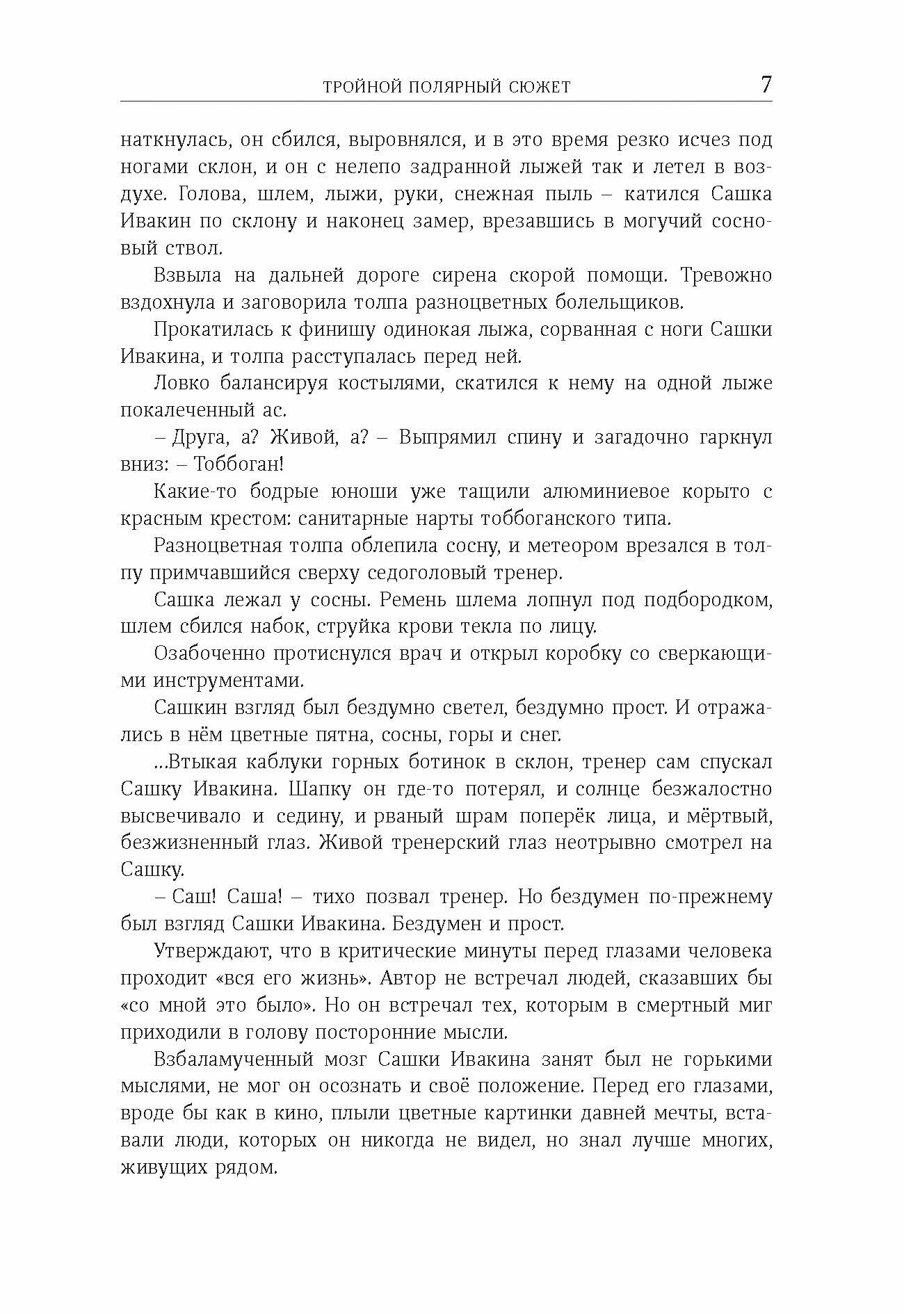 В книгу "Тройной полярный сюжет" вошли одноименная повесть Олега Куваева, повесть Юрия Казакова "Северный дневник" и одиннадцать рассказов из книги "Обыкновенная Арктика" Бориса Горбатова. Повесть "Тройной полярный сюжет" была впервые издана в 1973 году издательством "Современник". В ней причудливо переплелись судьбы людей разных эпох и стран, а розовая чайка стала символом мечты и высокой цели. Сашка Ивакин, бывший спортсмен-горнолыжник, студент и романтик, нашел свою судьбу в отдаленном чукотском поселке, где ослепший, но не сдавшийся обстоятельствам жизни, стал учителем географии, продолжая искать свою розовую чайку. "Северный дневник" - серия путевых очерков о Русском Севере. И пусть многие герои придуманы, многих событий не происходило, но это все равно правдивое повествование, рисующее прекрасную картину жизни на берегах Северного моря. Иногда это сказка, иногда былина, порой повествование или очерк, а бывает, что и статья, основанная на статистике. Белое море, сизое небо, черная вода, рыжие искры костра - Север Казакова играет в повести разными красками. "Обыкновенная Арктика". В 1935 году журналист Борис Горбатов в сопровождении полярного летчика отправился на остров Диксон и зимовал там. В следующем году он снова побывал в Арктике и участвовал в перелете над трассой Северного морского пути. Впечатления от жизни на Севере послужили основой для создания книги рассказов "Обыкновенная Арктика", которая увидела свет в 1940 году. Книга повествует о героическом повседневном труде полярников, самоотверженно осваивающих суровую Арктику в годы первых пятилеток.