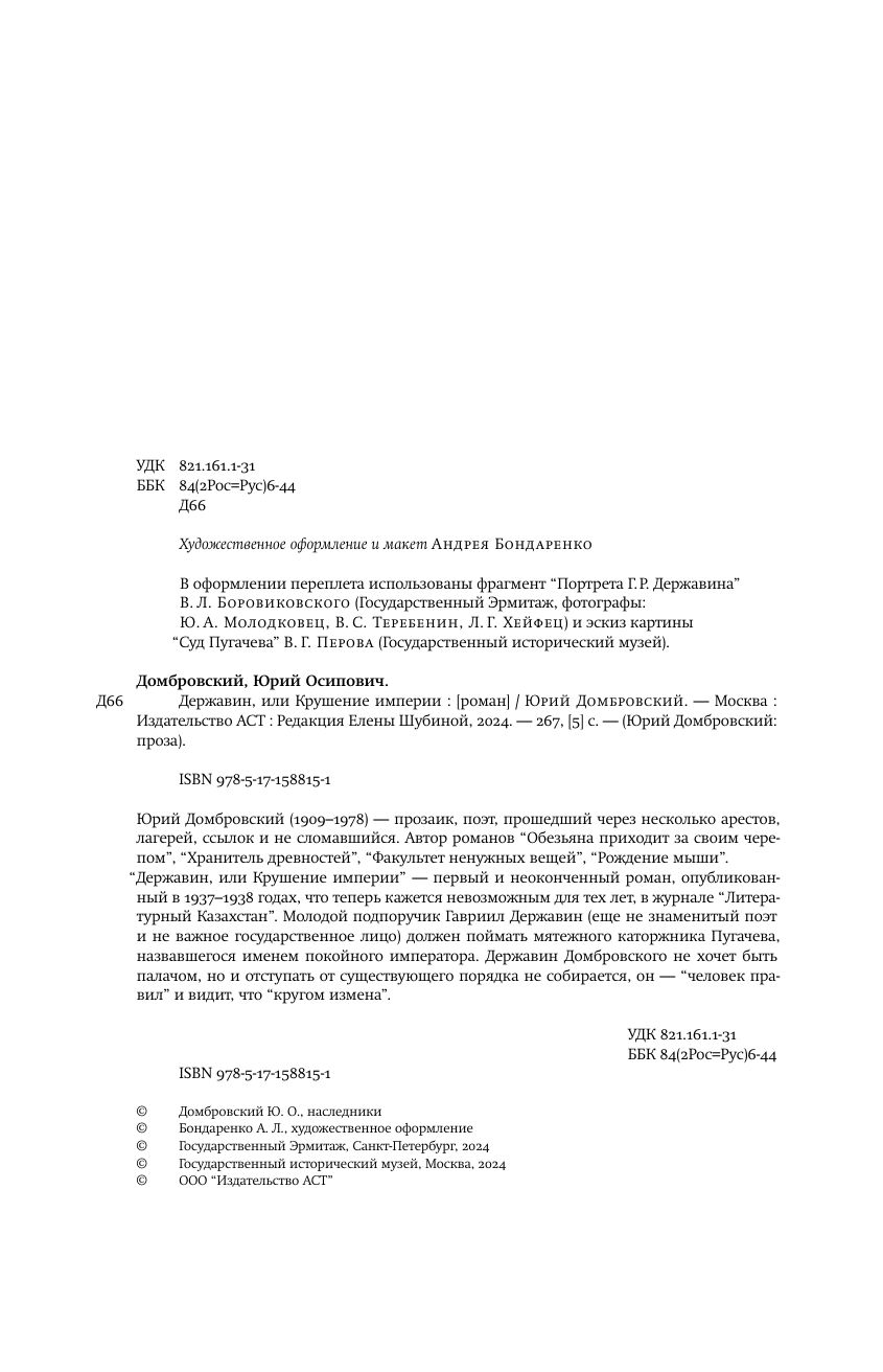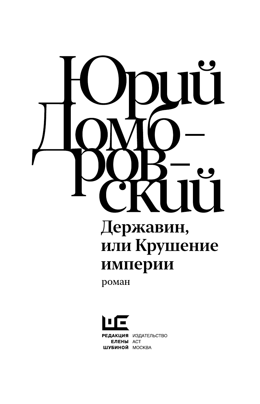 Юрий Домбровский (1909–1978) — прозаик, поэт, прошедший через несколько арестов, лагерей, ссылок и не сломавшийся. Автор романов “Обезьяна приходит за своим черепом”, “Хранитель древностей”, “Факультет ненужных вещей”, “Рождение мыши”. “Державин, или Крушение империи” — первый и неоконченный роман, опубликованный в 1937–1938 годах, что теперь кажется невозможным для тех лет, в журнале “Литературный Казахстан”. Молодой подпоручик Гавриил Державин (еще не знаменитый поэт и не важное государственное лицо) должен поймать мятежного каторжника Пугачева, назвавшегося именем покойного императора. Державин Домбровского не хочет быть палачом, но и отступать от существующего порядка не собирается, он — “человек правил” и видит, что “кругом измена”. “Но мятежи, — сказал Державин, — но кровь, затопившая землю, но пожары, виселицы? Ведали ли вы, что творили? Вы, как человек образованный, как могли сию ослепленную толпу за собой повести?” “Домбровский заглянул в бездну соотношений судьбы и поэта, гения и злодейства». «Державин» — это не романизированная биография, а энергичный дебют, изобилующий острыми ситуациями и пронизанный током высокого напряжения”. Юрий Давыдов