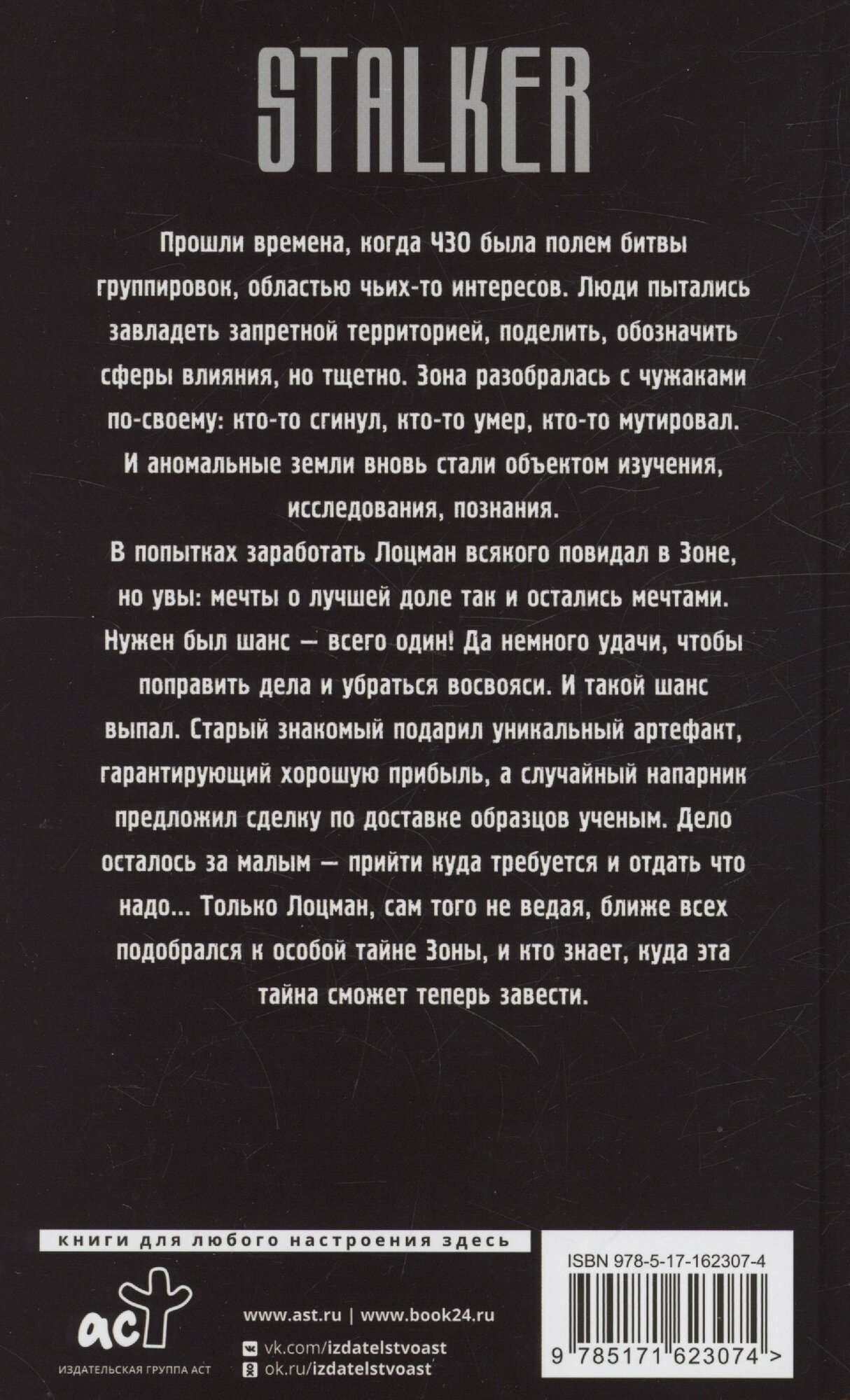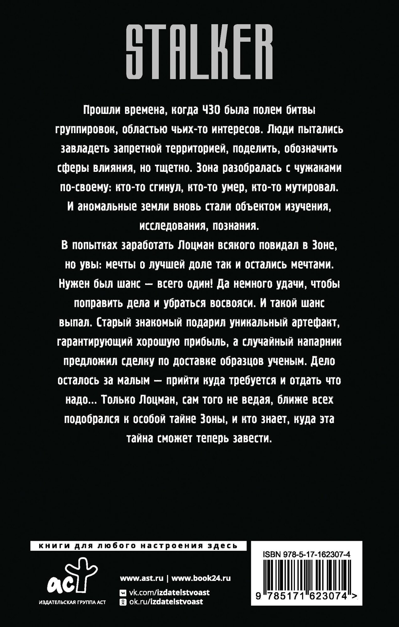 Прошли времена, когда ЧЗО была полем битвы группировок, областью чьих-то интересов. Люди пытались завладеть запретной территорией, поделить, обозначить сферы влияния, но тщетно. Зона разобралась с чужаками по-своему: кто-то сгинул, кто-то умер, кто-то мутировал. И аномальные земли вновь стали объектом изучения, исследования, познания. В попытках заработать Лоцман всякого повидал в Зоне, но увы: мечты о лучшей доле так и остались мечтами. Нужен был шанс — всего один! Да немного удачи, чтобы поправить дела и убраться восвояси. И такой шанс выпал. Старый знакомый подарил уникальный артефакт, гарантирующий хорошую прибыль, а случайный напарник предложил сделку по доставке образцов ученым. Дело осталось за малым — прийти куда требуется и отдать что надо... Только Лоцман, сам того не ведая, ближе всех подобрался к особой тайне Зоны, и кто знает, куда эта тайна сможет теперь завести.