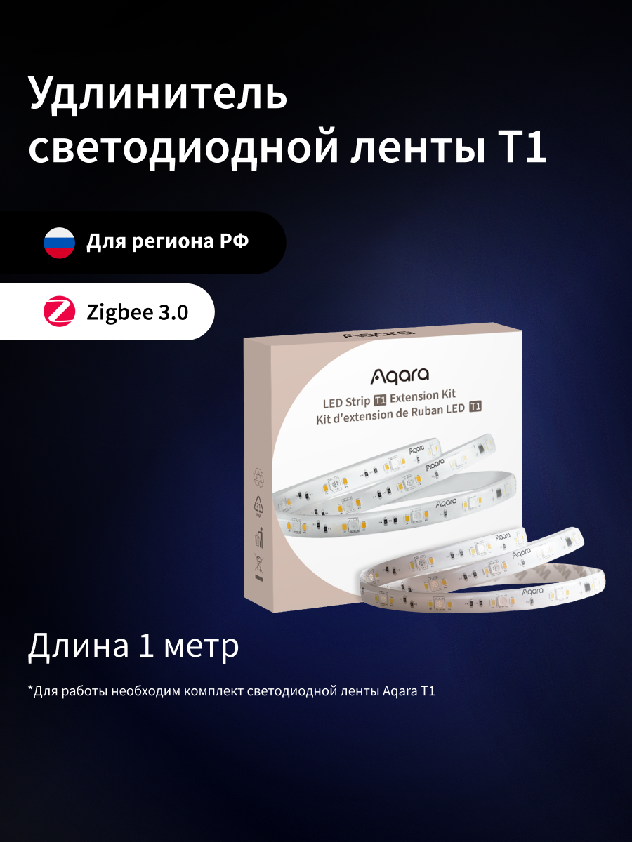 С помощью удлинителя вы сможете увеличить ленту до 10 м и сделать помещение ещё более красочным. Он подключается к разъёму ленты Aqara LED Strip T1.У ленты Aqara LED Strip T1 есть контроллер и блок питания. С помощью контроллера вы можете управлять яркостью и цветами LED-ленты. Также лента поддерживает адаптивное освещение от HomeKit.Управлять лентой можно не только с помощью автоматизаций, но и удалённо через приложение Aqara Home или голосовых помощников, а также механически с помощью пульта, который находится на ленте.