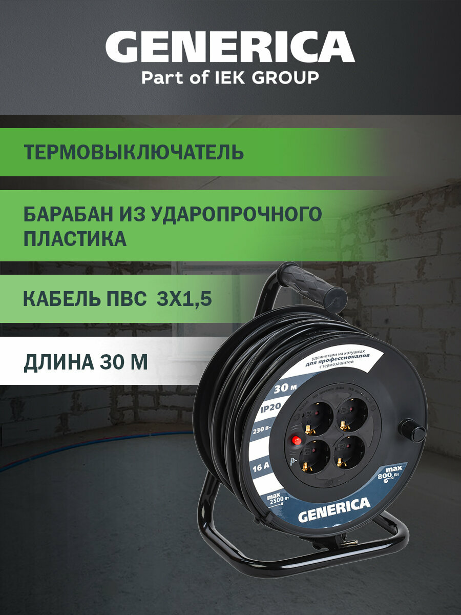 Удлинитель GENERICA на катушке 4х30м 16А IP20 УК30 2P+PE 3х1.5 термозащита WKP20-16-04-30-G
