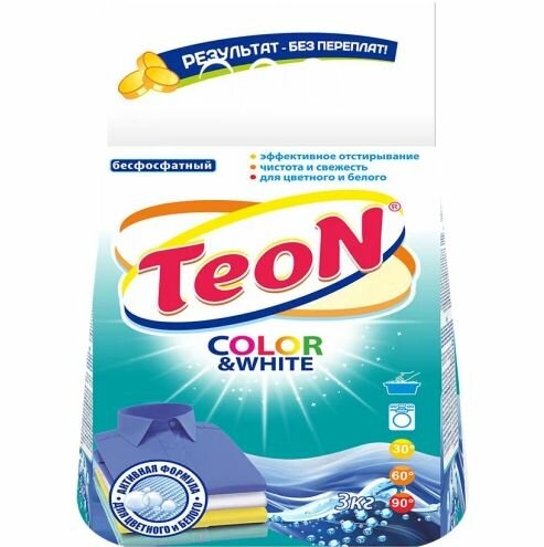 Стиральный порошок Teon стиральный порошок с отличным соотношением цена/качество. Порошок можно использовать для ручной и автоматической стирки. Предназначен для стирки белых и цветных вещей. Быстро и эффективно удаляет основные загрязнения. Хорошо растворяется в воде и выполаскивается из тканей.