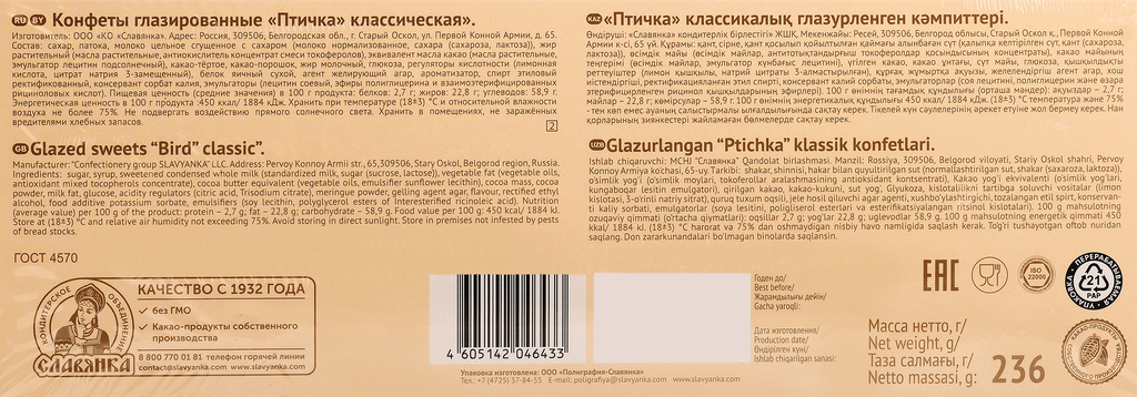 | Состав | сахар, патока, молоко цельное сгущенное с сахаром (молоко нормализованное, сахара (сахароза, лактоза)), жир растительный (масла растительные, антиокислитель концентрат смеси токоферолов), эквивалент масла какао (масла растительные, эмульгатор лецитин подсолнечный), какао-тёртое, какао-порошок, жир молочный, глюкоза, регуляторы кислотности (лимонная кислота, цитрат натрия 3-замещенный), заменитель масла какао (масла растительные, эмульгаторы (е492, лецитин соевый)), белок яичный сухой, агент желирующий агар, ароматизатор, спирт этиловый ректификованный, консервант сорбат калия, эмульгаторы (лецитин соевый, эфиры полиглицерина и взаимоэтерифицированных рициноловых кислот). |