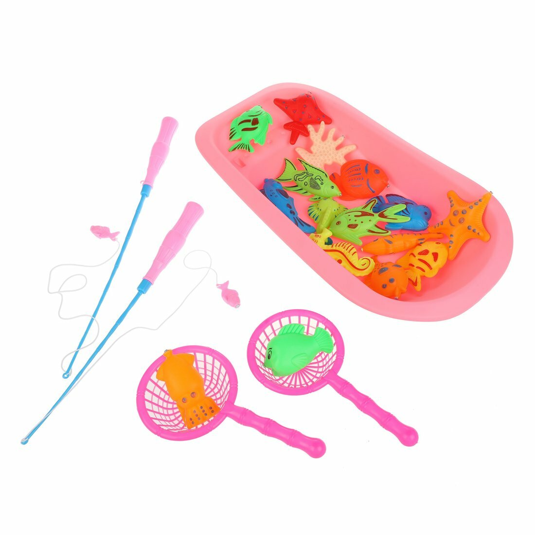 В комплекте есть 2 удочки, 2 сита, ванночка, 16 фигурок морских обитателей, которые ребёнку предстоит поймать. Улов обещает быть крупным!