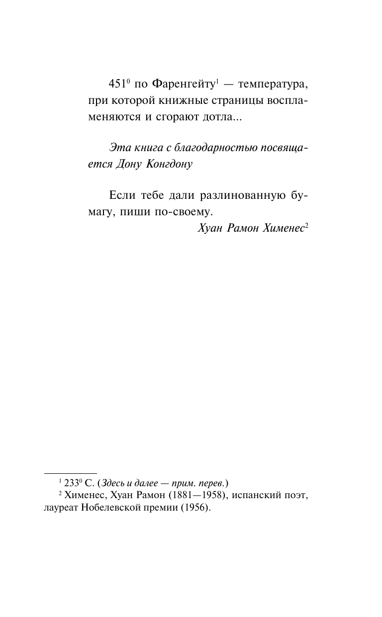 Философская антиутопия Брэдбери рисует беспросветную картину развития постиндустриального общества: это мир будущего, в котором все письменные издания безжалостно уничтожаются специальным отрядом пожарных, а хранение книг преследуется по закону, интерактивное телевидение успешно служит всеобщему оболваниванию, карательная психиатрия решительно разбирается с редкими инакомыслящими, а на охоту за неисправимыми диссидентами выходит электрический пес. Роман, принесший своему творцу мировую известность. Сенсационным было заявление Брэдбери в 2007 году, что "451 по Фаренгейту" понимают неправильно. Эта книга не о правительственной цензуре, это история о том, как телевидение уничтожает интерес к чтению книг. В начале 1950-х большинство американцев в глаза не видело телевизора, однако Брэдбери предсказал наступление новой эры свободы, достатка и развлечений, когда желание быть счастливым, помноженное на политкорректность, приведет к запрету книг. "Телевизор говорит вам, о чем надлежит думать, и вколачивает это вам в голову. Он всегда и обязательно прав".