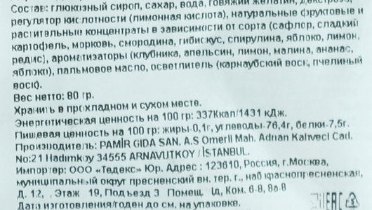 | Состав | Сироп глюкозный, сахар-песок, желирующий агент: желатин, декстроза, регулятор кислотности: лимонная кислота, концентраты фруктовые и растительные |