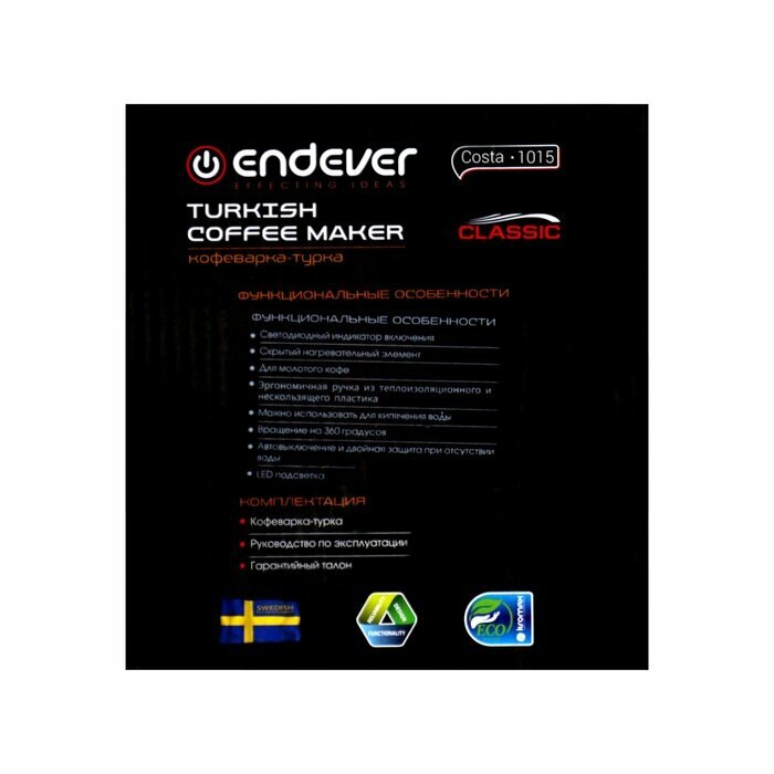 Электрическая кофеварка-турка от Endever - это идеальное решение для любителей ароматного и вкусного молотого кофе! Благодаря компактному дизайну и стильному внешнему виду, она легко впишется в интерьер любой кухни. Объем в 0,4 литра позволит приготовить одну или две чашки кофе, в зависимости от ваших предпочтений. Скрытый нагревательный элемент обеспечивает равномерное нагревание и сохранение аромата кофе. Мощность в 600 Ватт гарантирует быстрое приготовление напитка.