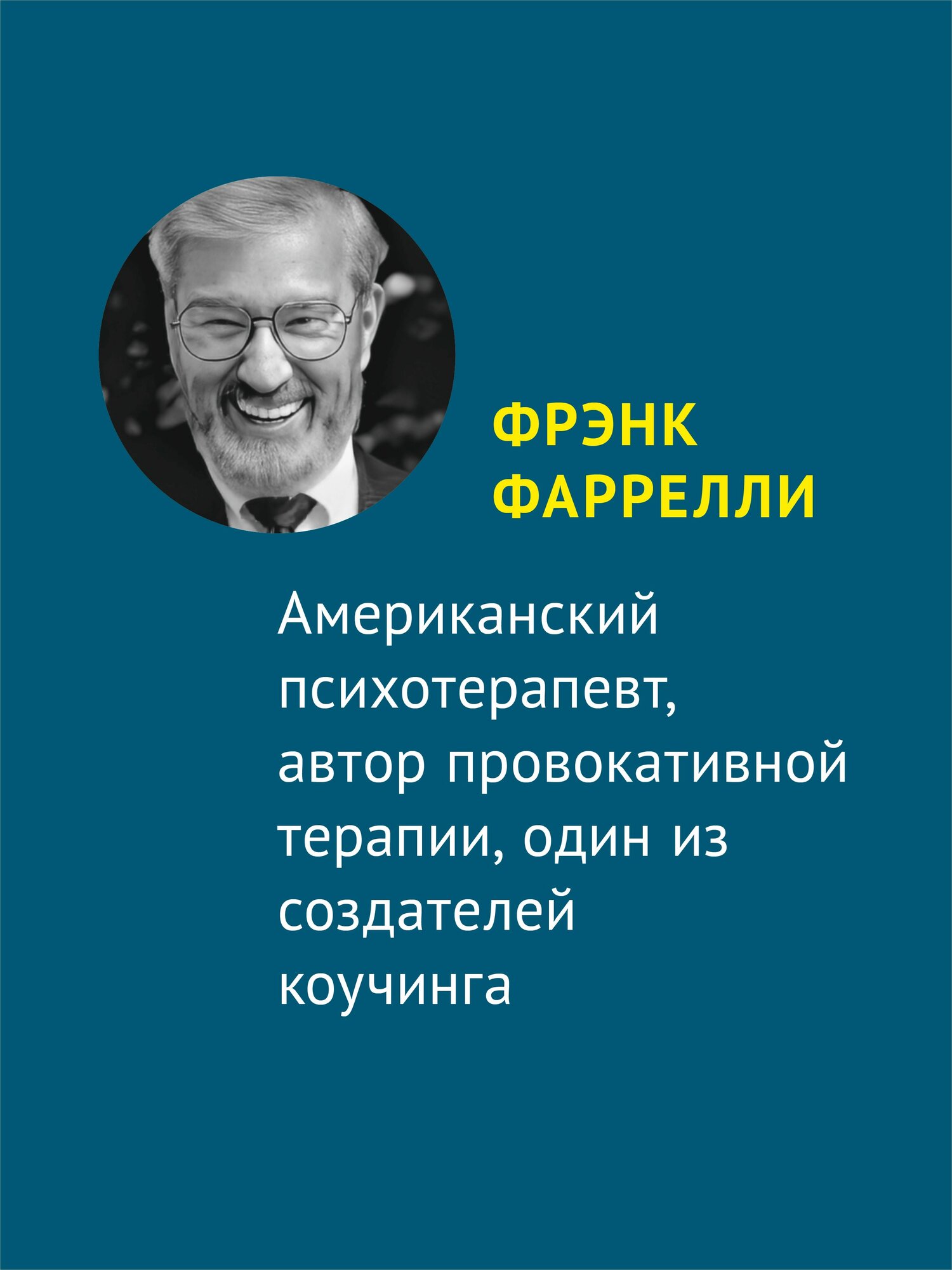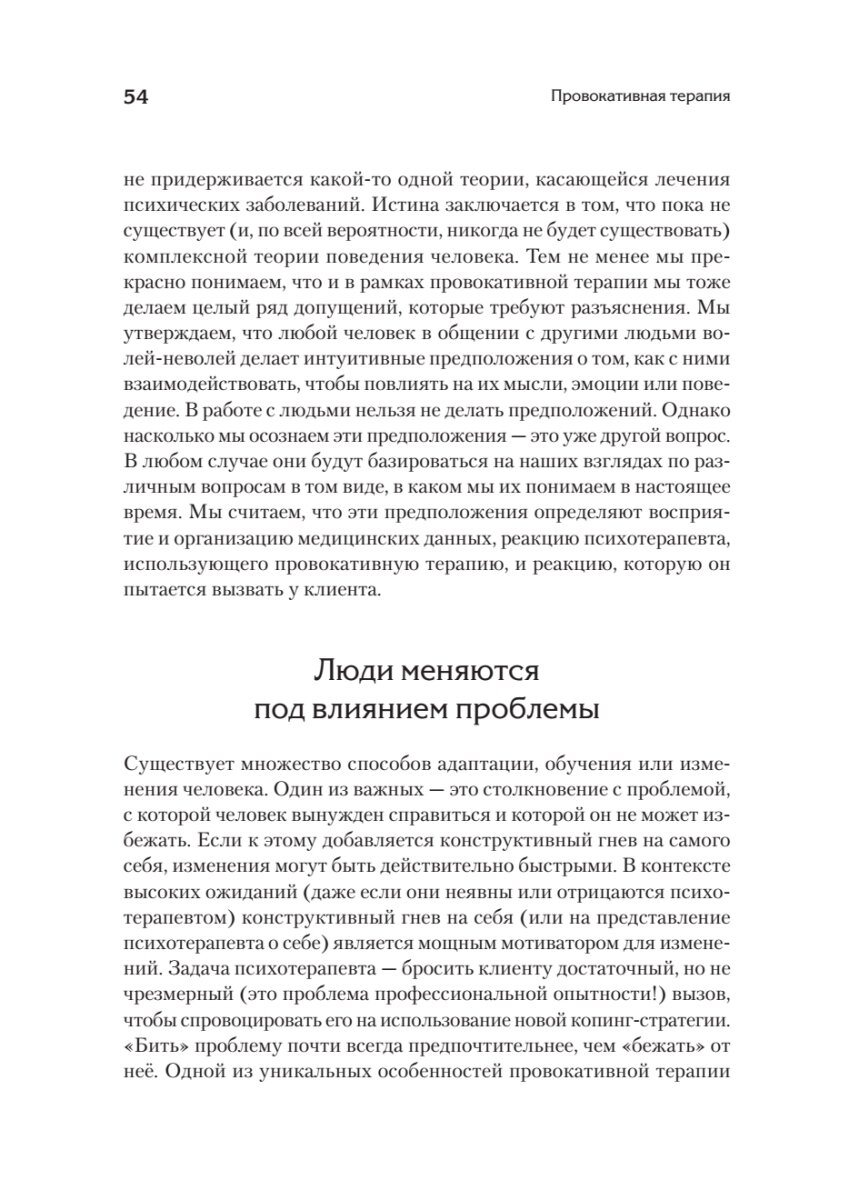На страницах этой книги предпринимается попытка уловить удивительную сущность человеческой натуры. В том виде искусства, которым до сих пор в значительной степени является психотерапия, художников немного, но Фрэнк Фаррелли один из них. Его жизнь, устремления, яркие поступки и неизбежные ошибки стали искрой для этого труда, задача которого рассказать об иной философии исцеления и показать модели поведения практикующим специалистам, ещё не подобравшим «ключик» к своим клиентам или самим себе. Провокативная психотерапия формирует новый взгляд на живого человека, опутанного сетями современных проблем и реалий нашего общества. Возможно, чтение этой книги будет похоже на участие в самом процессе провокативной терапии, но этого не избежать. Надеемся, это участие будет полезным и приятным.
