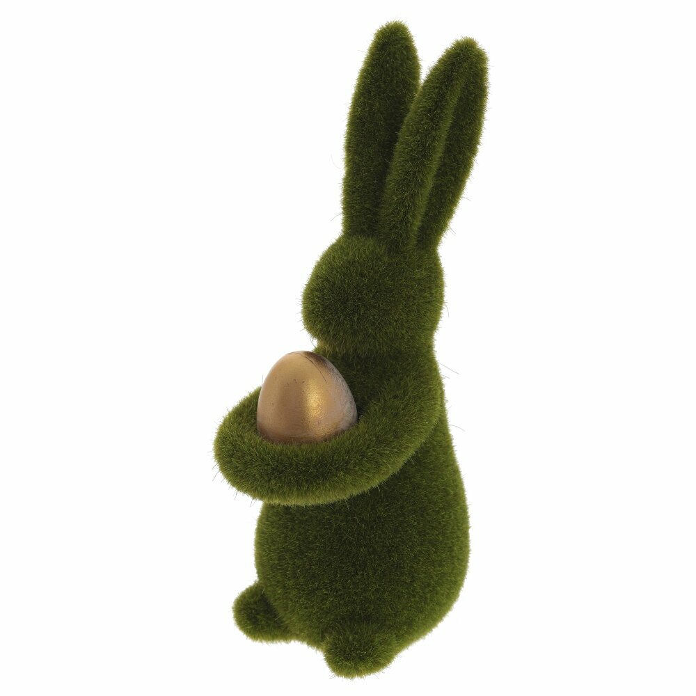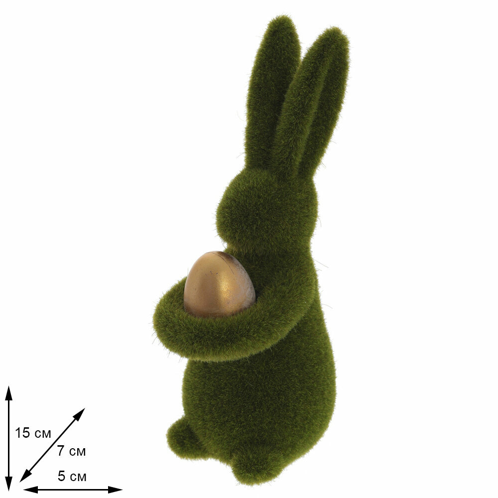 Фигурка "Заяц" - прекрасное украшение для вашего дома. Изготовленная из полимерных материалов, она обладает прочностью и изящностью в равной мере. Фигурка имеет небольшие размеры , что позволяет легко разместить ее в любом уголке помещения. Зеленое флоковое покрытие придает ей нежность и шарм. Отличительной особенностью этого зайца является золотое яйцо, которое он нежно держит своими лапками. Такой милый образ добавит в ваш интерьер нотку загадочности и утонченности.