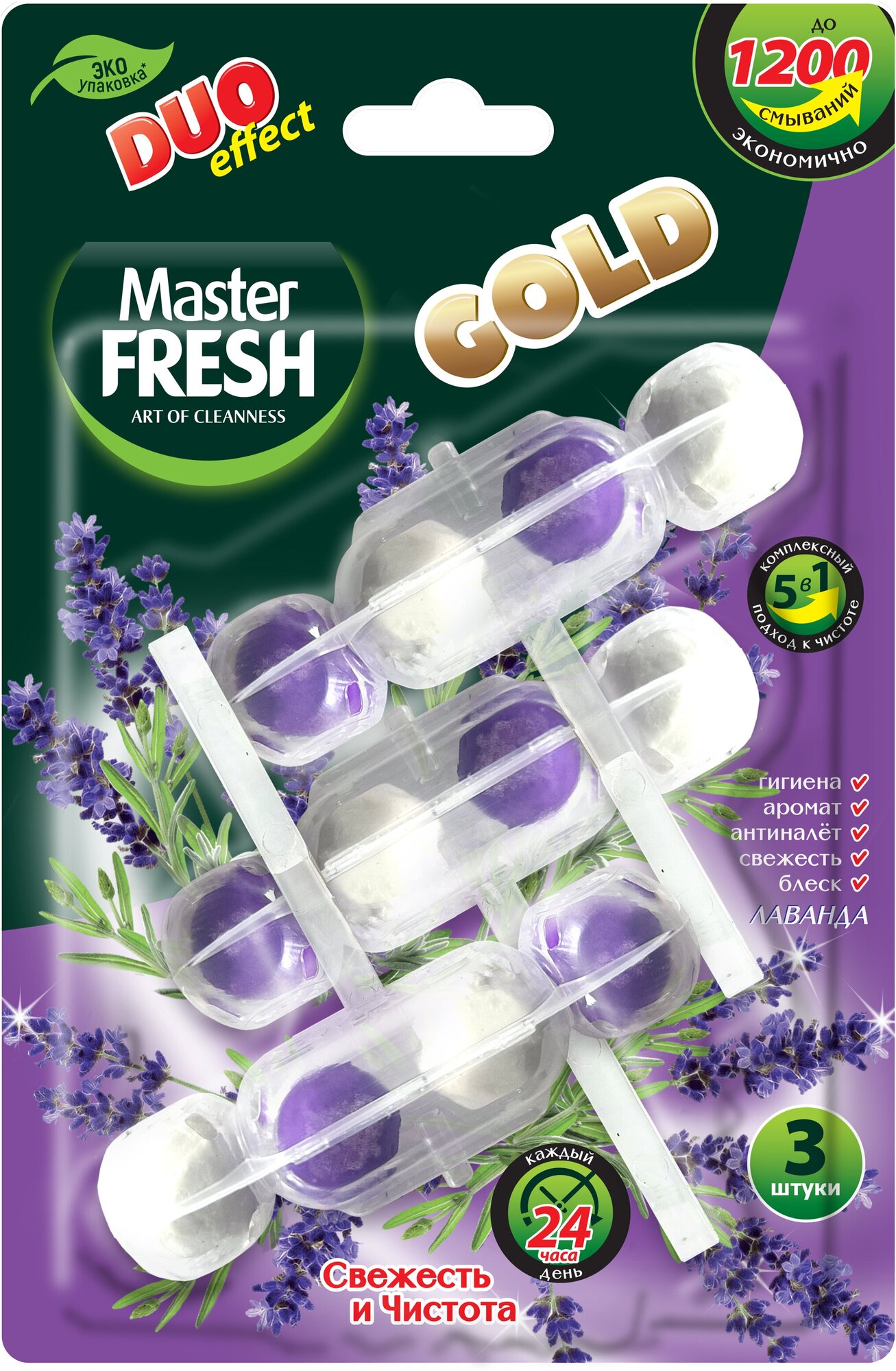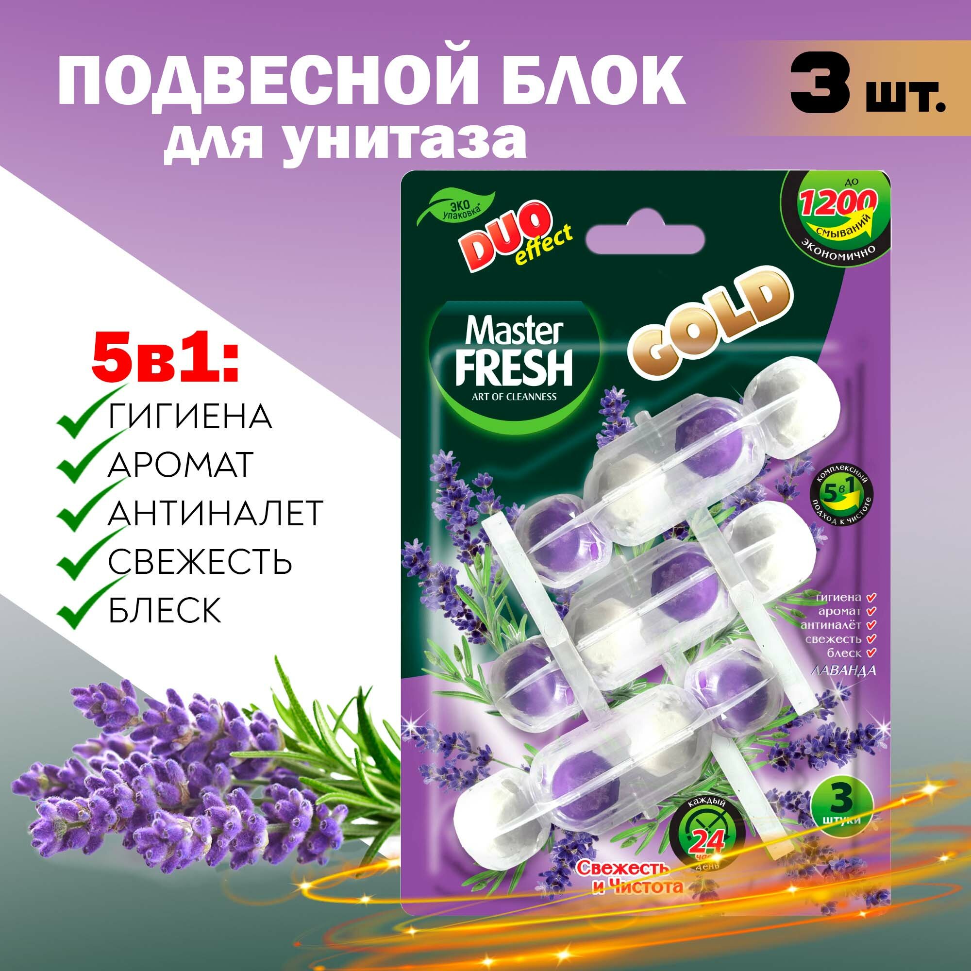Подвесной блок для унитаза Master Fresh Duo Effect 5в1 формула Gold Лаванда 3 шт