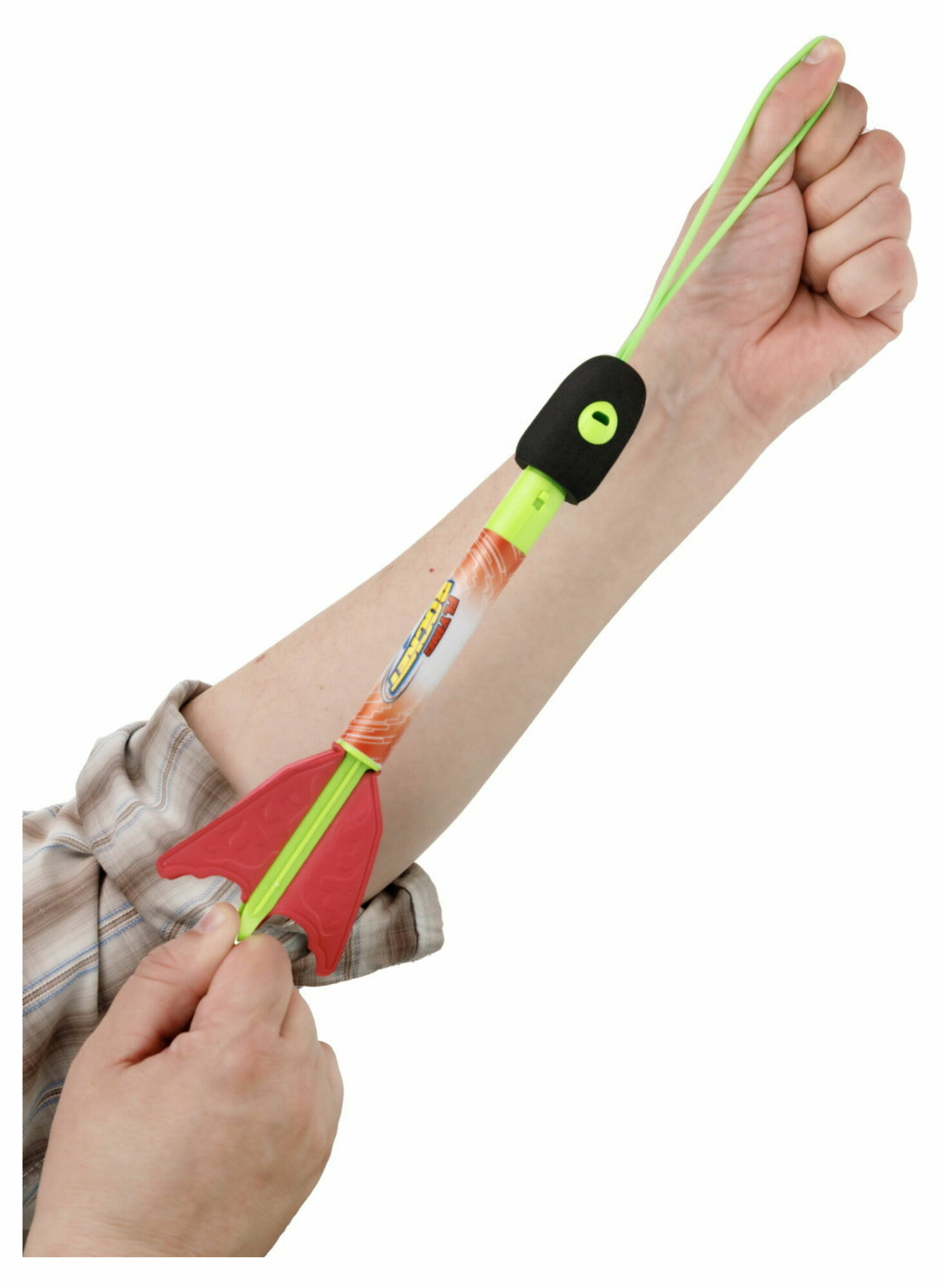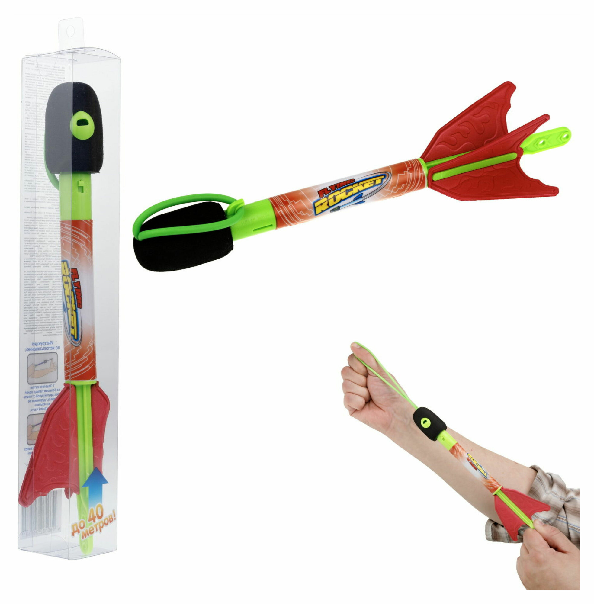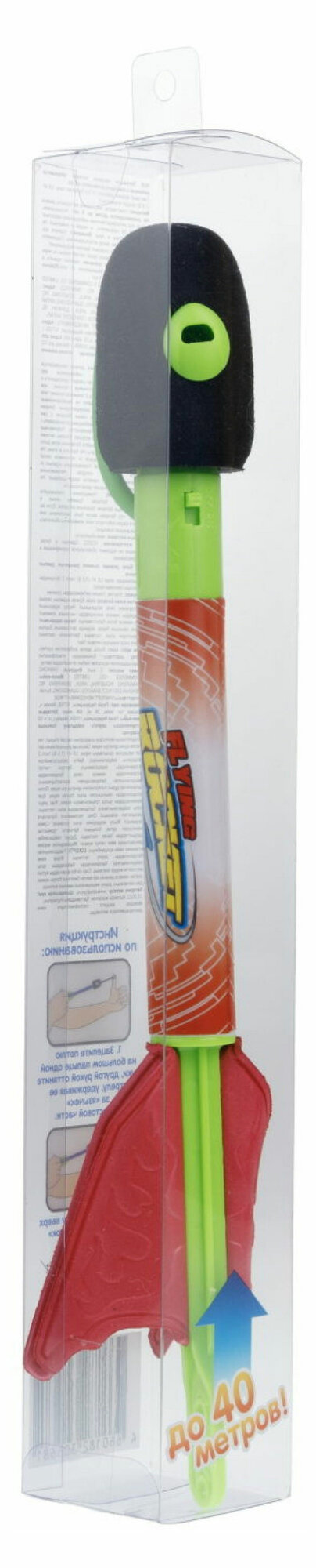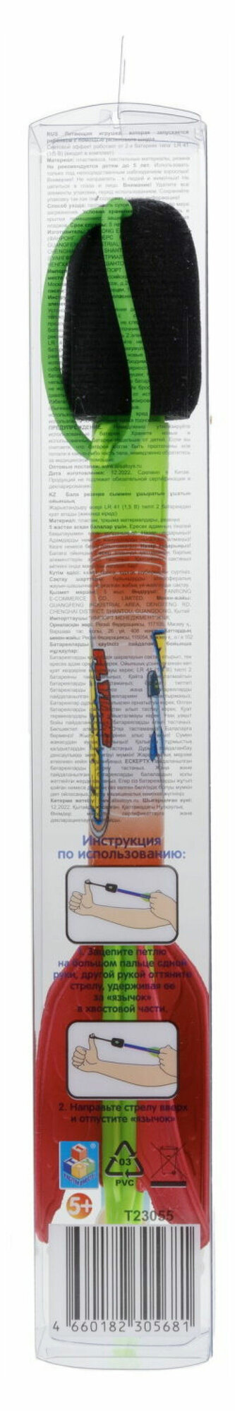 Летающая игрушка "Street Battle" от бренда 1TOY - это стрела размером 27 см. с EVA наконечником и световыми эффектами, которая запускается с помощью резинового шнура. Стрела может лететь до 40 метров! Зацепите петлю на большом пальце одной руки, другой рукой оттяните стрелу, удерживая ее за "язычок" в хвостовой части. Направьте стрелу вверх и отпустите "язычок". Световой эффект работает от 2-х батареек типа LR 41 (1,5 B) (входят в комплект).