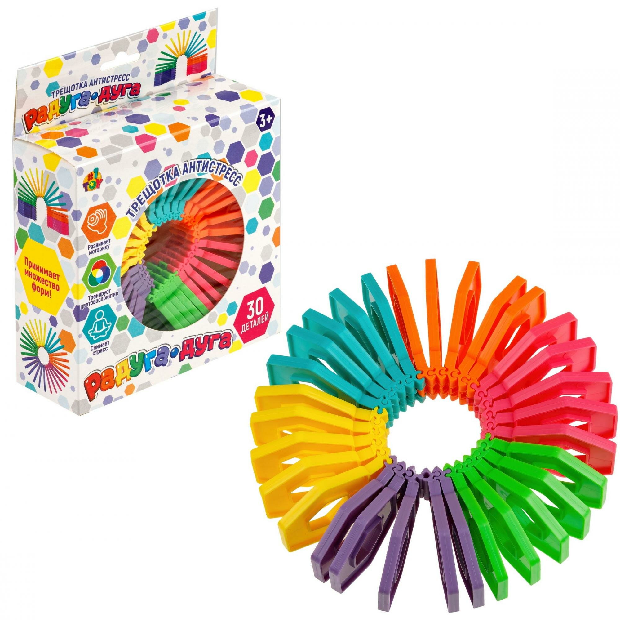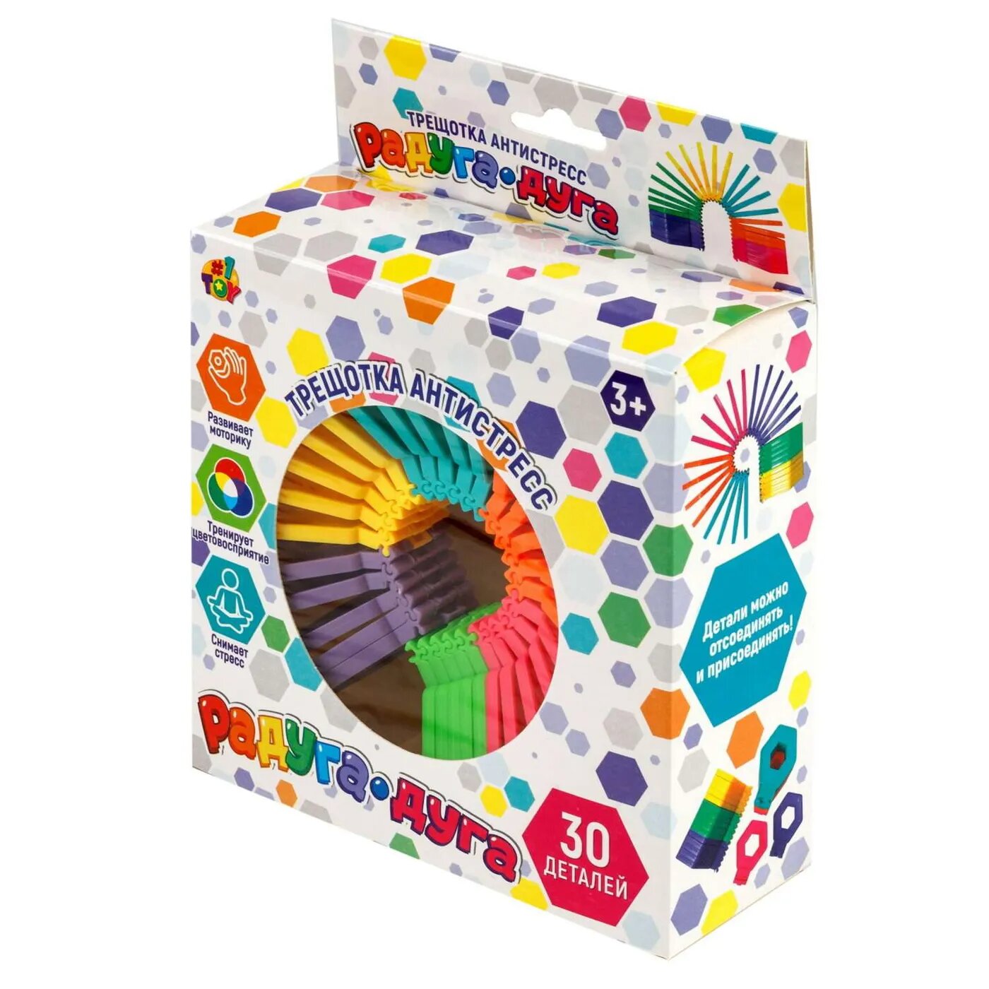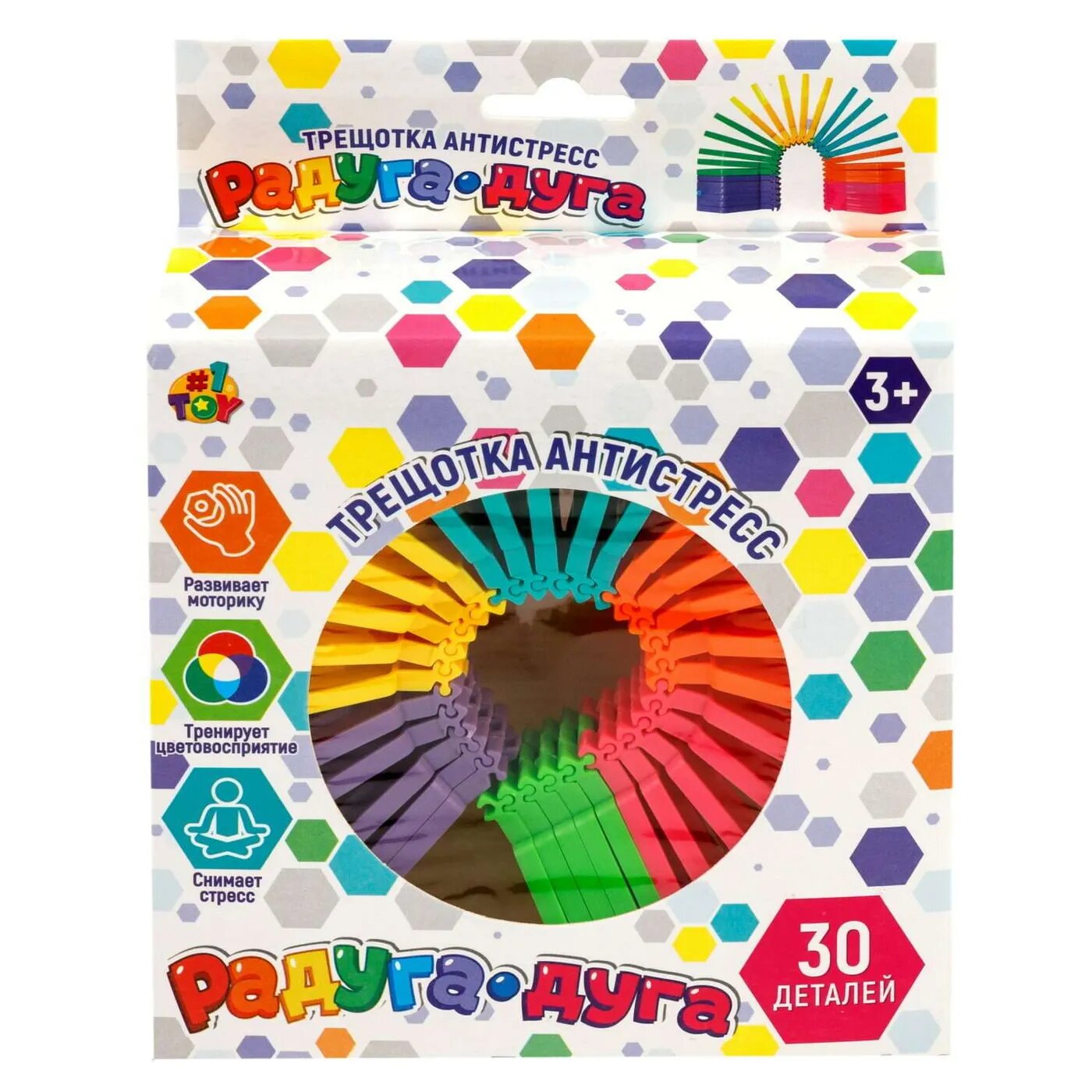 Игрушка со звуковыми эффектами шестигранная трещотка-антистресс "Радуга-Дуга" от бренда 1TOY принимает множество форм и состоит из 30 деталей. Радуга-Дуга развивает мелкую моторику, тренирует цветовосприятие и снимает стресс.