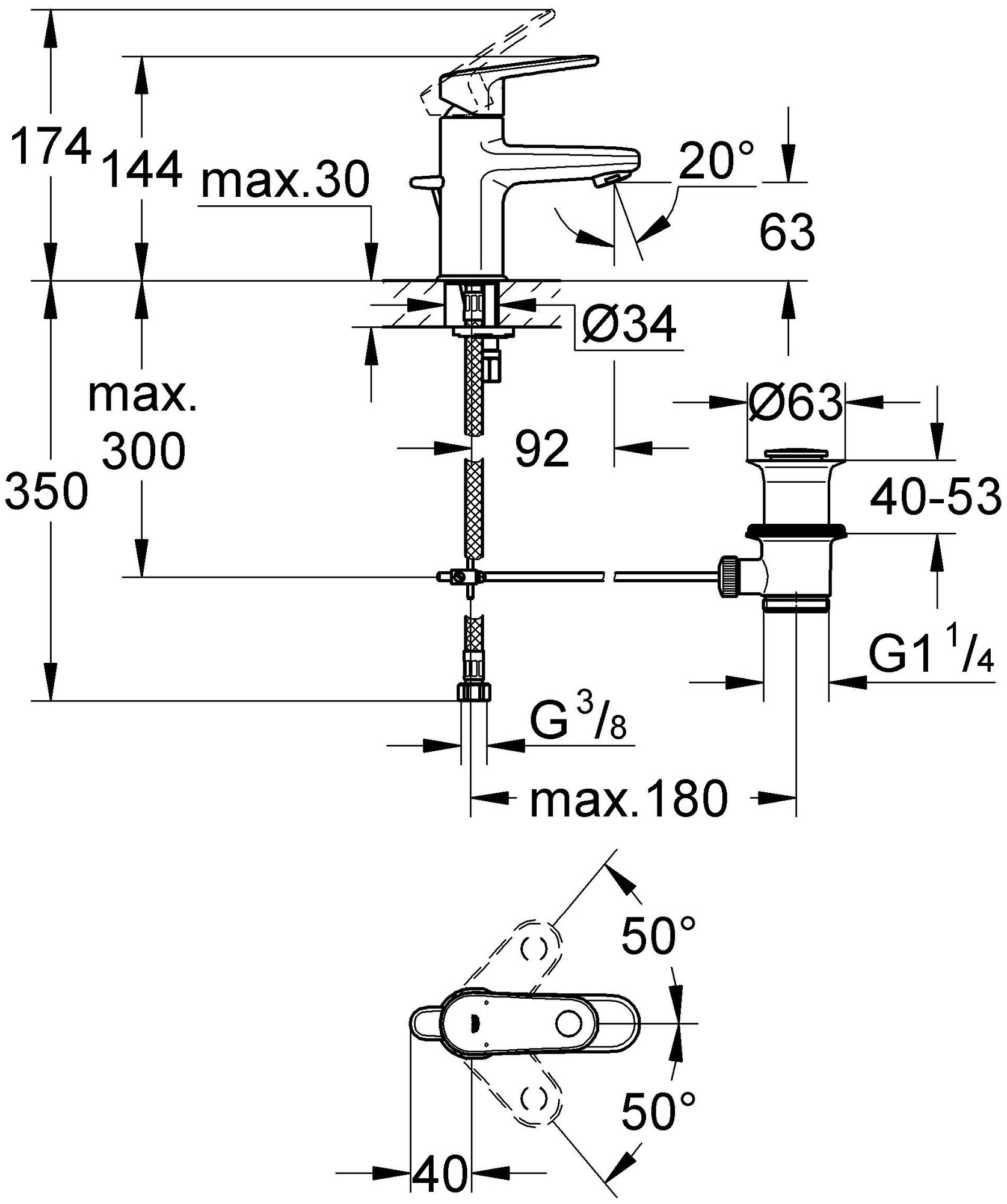 Смеситель однорычажный для раковины Grohe Europlus II 33156 гибкая подводка, монтаж на одно отверстие, уменьшенный вариант, металлический рычаг, керамический картридж 28 мм, поверхность GROHE StarLight®. Цвет: хром.