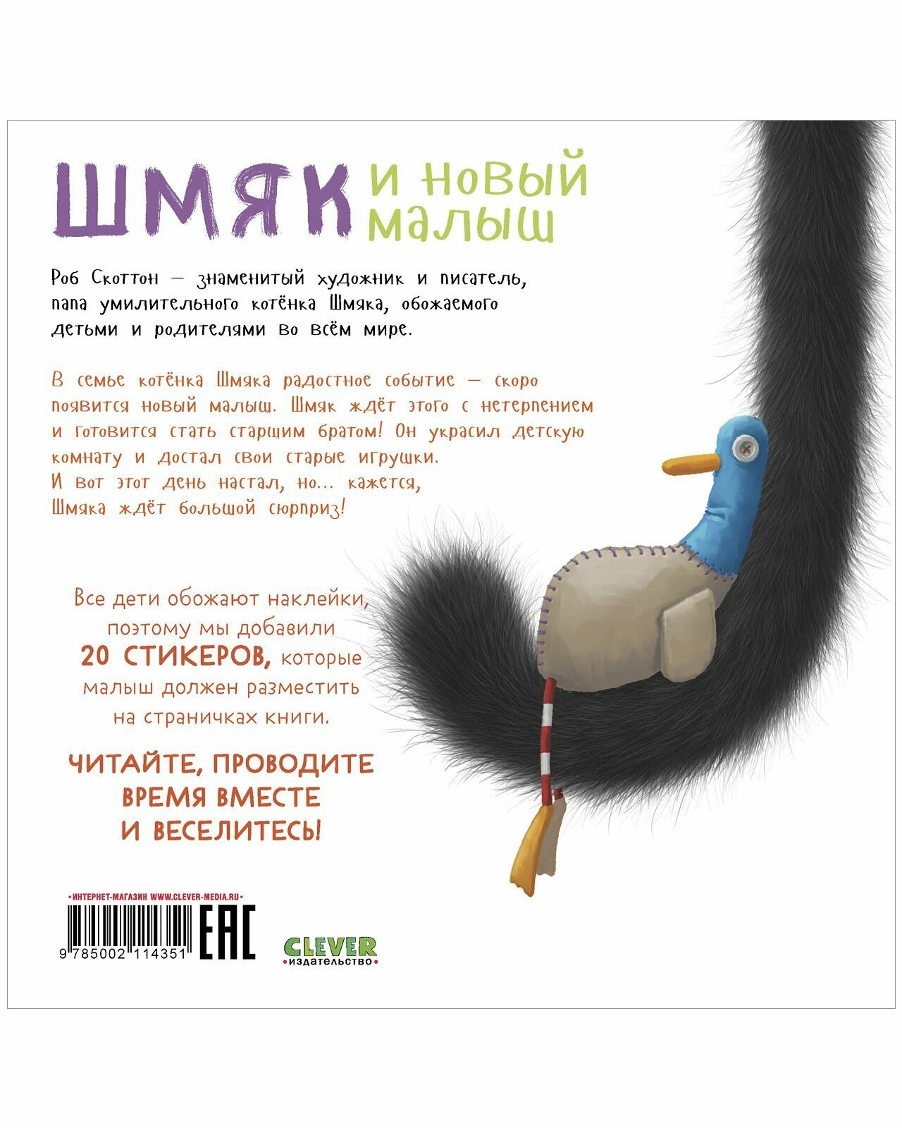 Роб Скоттон знаменитый художник и писатель, папа умилительного котёнка Шмяка, обожаемого детьми и родителями во всём мире. В семье котёнка Шмяка радостное событие скоро появится новый малыш. Шмяк ждёт этого с нетерпением и готовится стать старшим братом! Он украсил детскую комнату и достал свои старые игрушки. И вот этот день настал, но кажется, Шмяка ждёт большой сюрприз! Все дети обожают наклейки, поэтому мы добавили 20 СТИКЕРОВ, которые малыш должен разместить на страничках книги. ЧИТАЙТЕ, ПРОВОДИТЕ ВРЕМЯ ВМЕСТЕ И ВЕСЕЛИТЕСЬ!