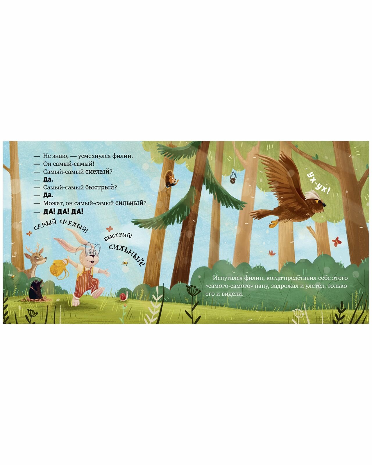 Елена Ульева автор детских развивающих книг, изданных совокупным тиражом 11 млн экземпляров. Зайчонок знал, что его папа самый лучший папа на свете. В лесной школе он всем рассказал, какой у него замечательный папа, НО ЕМУ НИКТО НЕ ПОВЕРИЛ. Зайчонок столкнулся с трудностями: чуть не подрался со злым волком, справился с насмешками филина и даже перехитрил лисёнка. В этом ему помогли папины мудрые советы, поддержка и безграничная отцовская любовь.