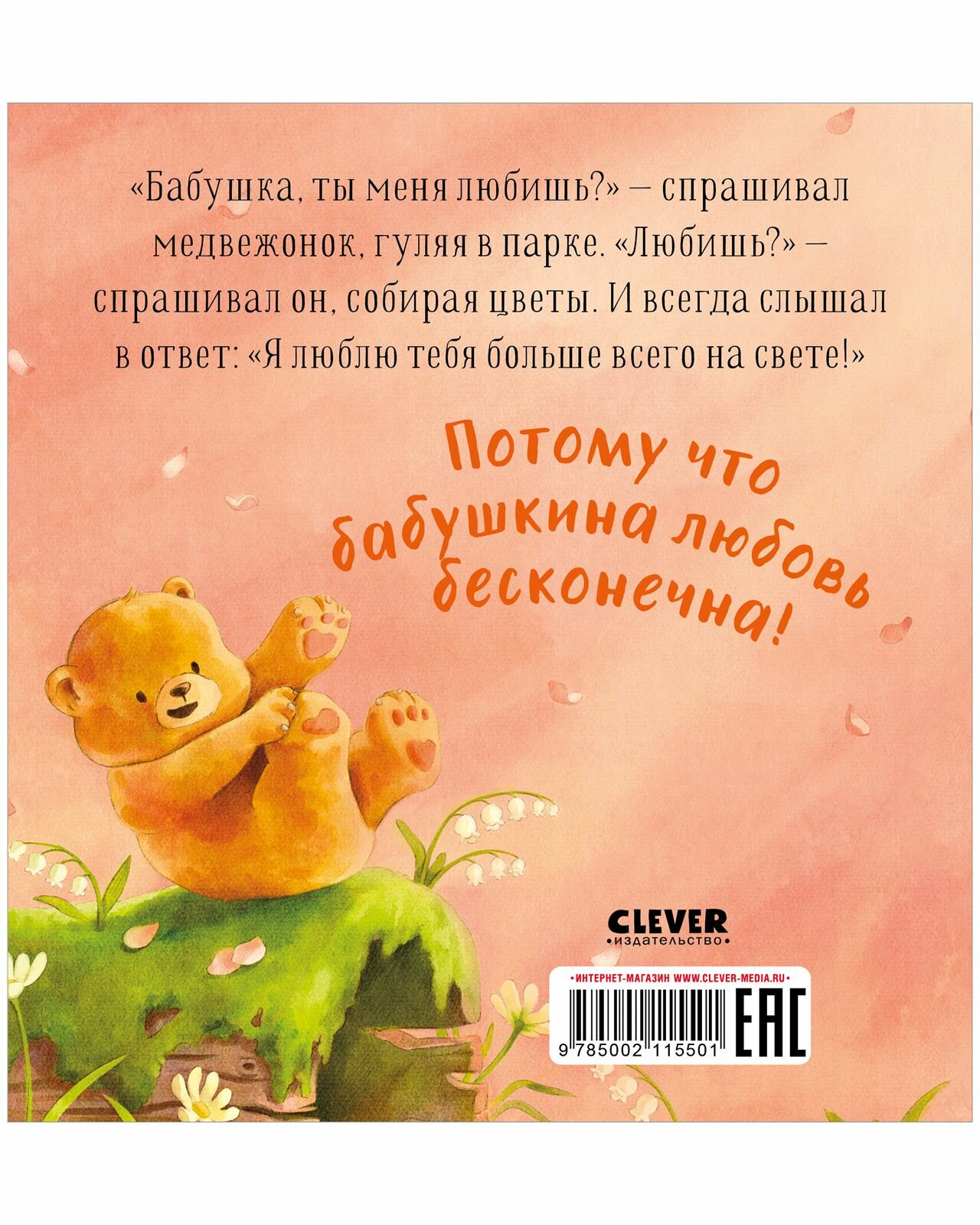 «Бабушка, ты меня любишь?» - спрашивал медвежонок, гуляя в парке. «Любишь?» - спрашивал он, собирая цветы. И всегда слышал в ответ: «Я люблю тебя больше всего на свете!» Потому что бабушкина любовь бесконечна!