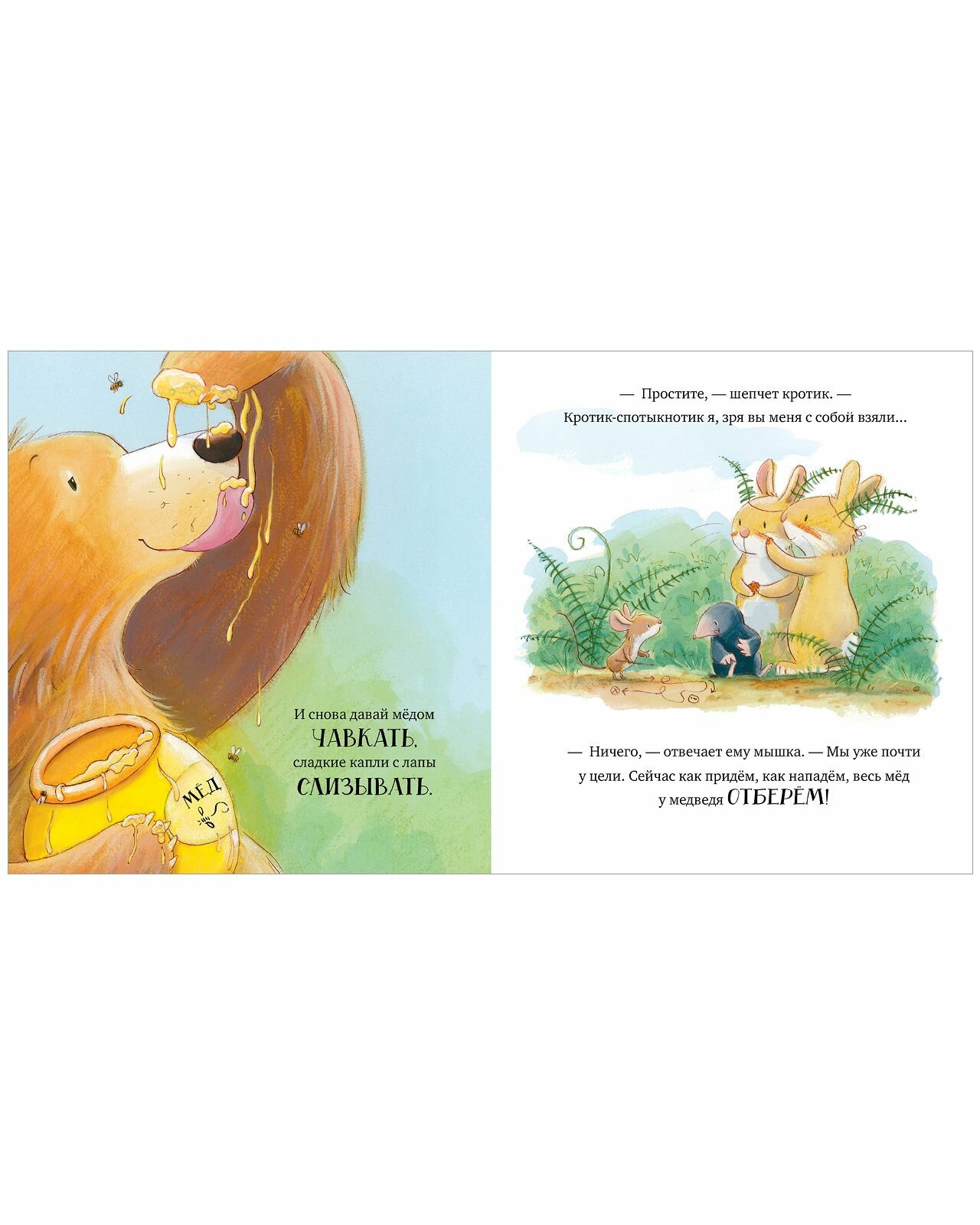 У медведя есть большо-о-ой горшок вкуснейшего меда. И он не намерен ни с кем делиться! Но мышка, кротик и братцы-зайцы о-о-очень голодные. Смогут ли они пробраться через заросли густого леса и заполучить мед так, чтобы грозный медведь их не заметил? История от любимой Джейн Чапмен, неожиданная развязка и юмор всё это вы найдёте в книжке «Лапы прочь от мёда!»