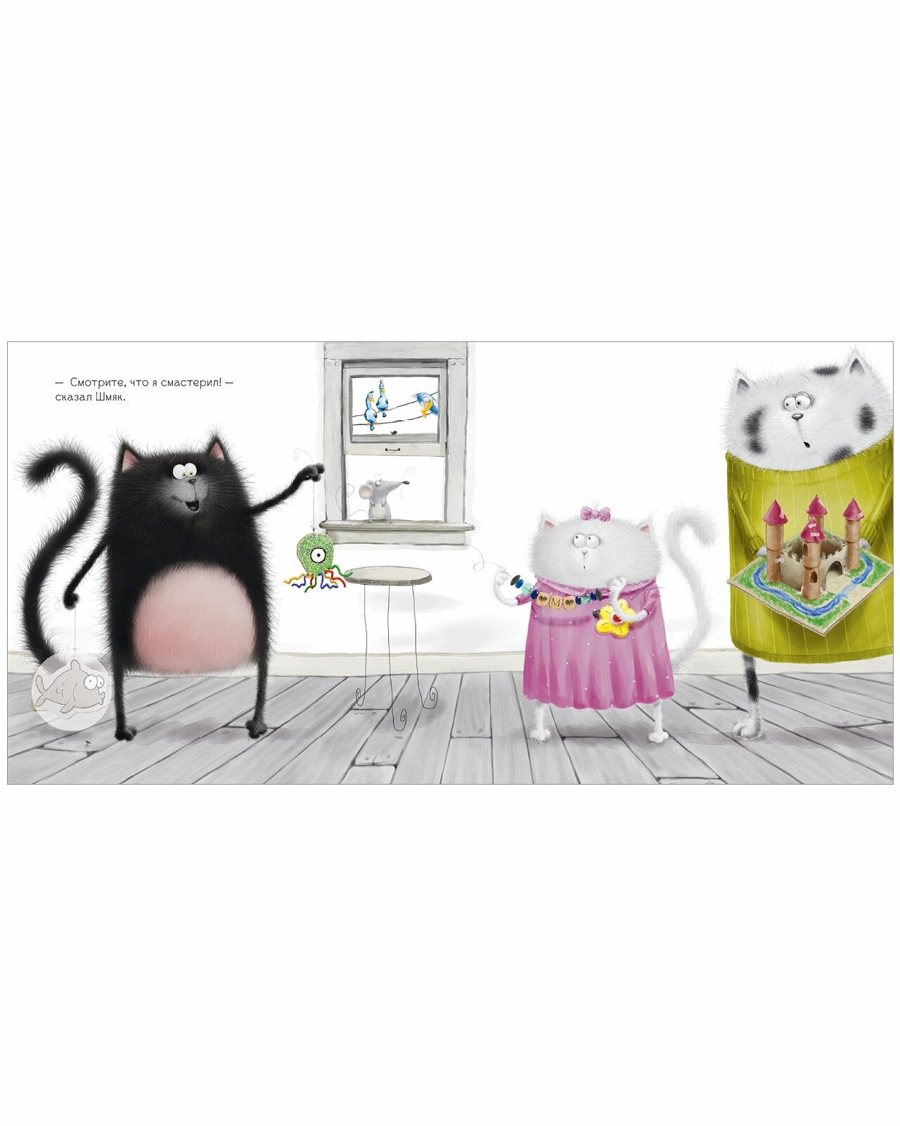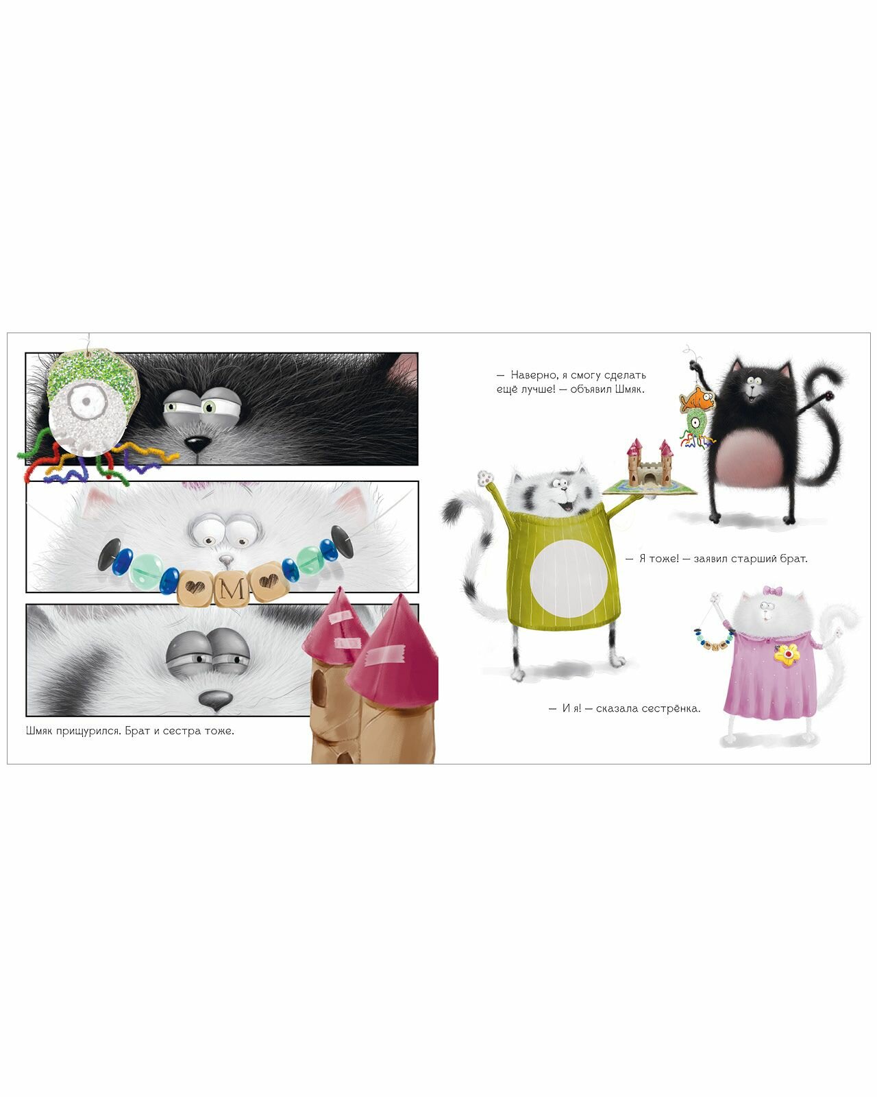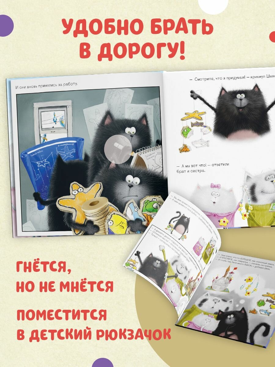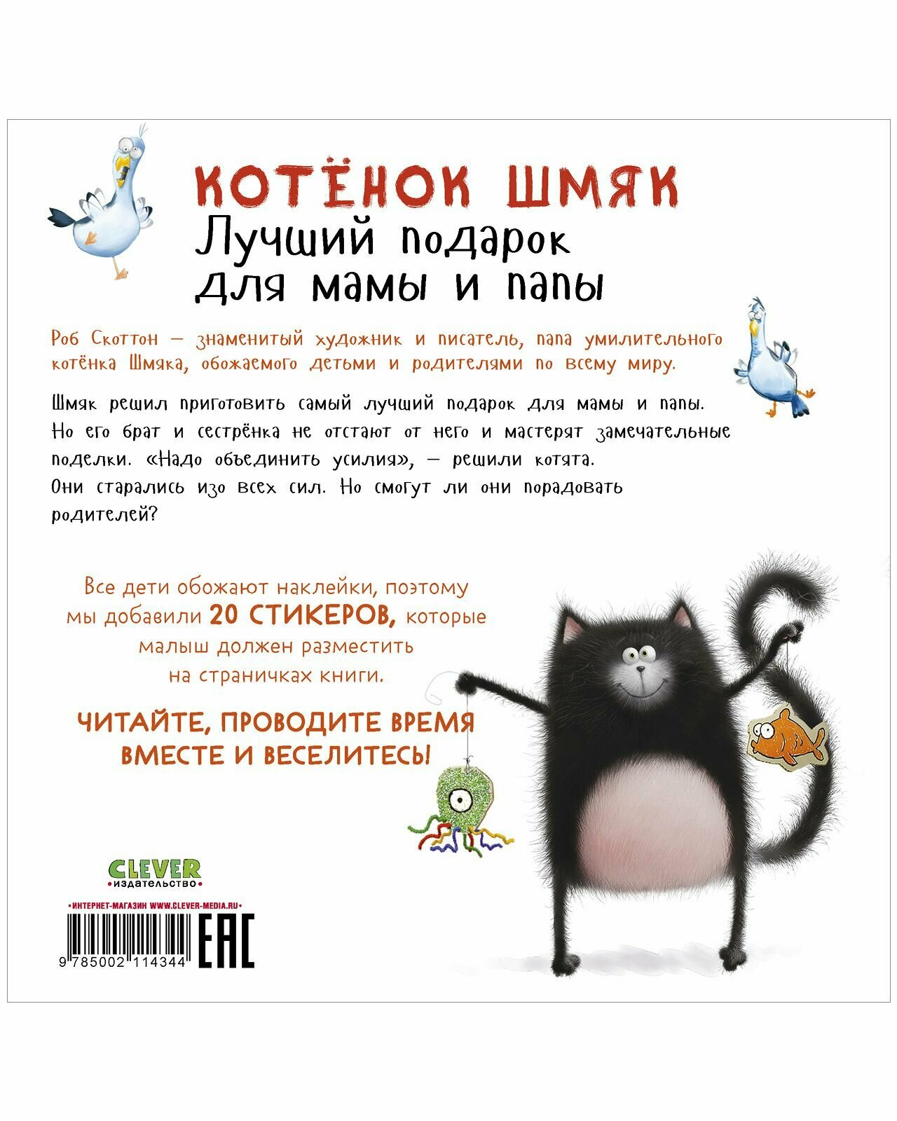 Роб Скоттон знаменитый художник и писатель, папа умилительного котёнка Шмяка, обожаемого детьми и родителями по всему миру. Шмяк решил приготовить самый лучший подарок для мамы и папы. Но его брат и сестрёнка не отстают от него и мастерят замечательные поделки. «Надо объединить усилия», решили котята. Они старались изо всех сил. Но смогут ли они порадовать родителей? Все дети обожают наклейки, поэтому мы добавили 20 СТИКЕРОВ, которые малыш должен разместить на страничках книги. ЧИТАЙТЕ, ПРОВОДИТЕ ВРЕМЯ ВМЕСТЕ И ВЕСЕЛИТЕСЬ!