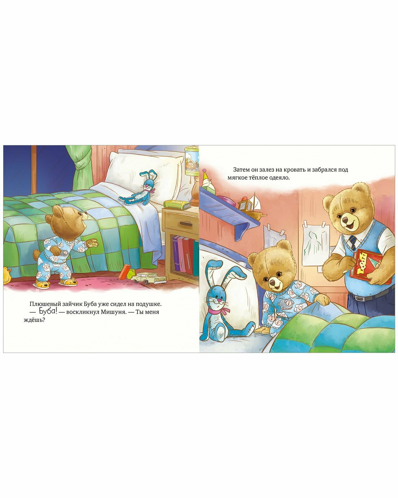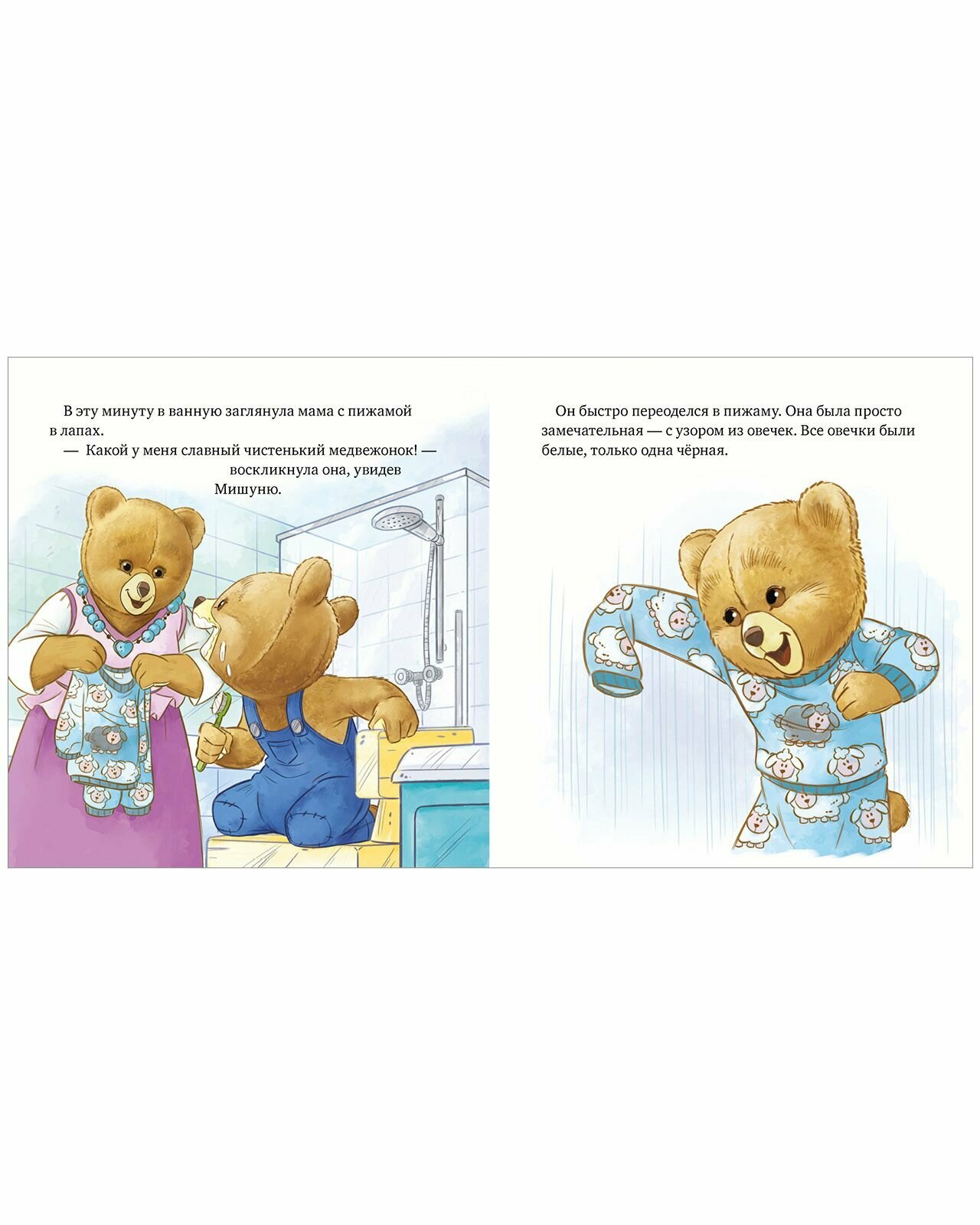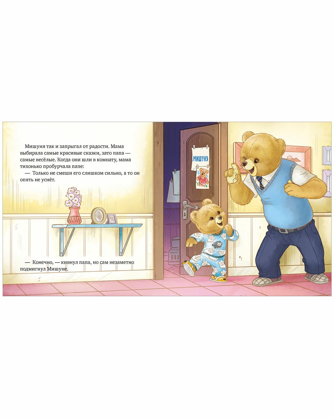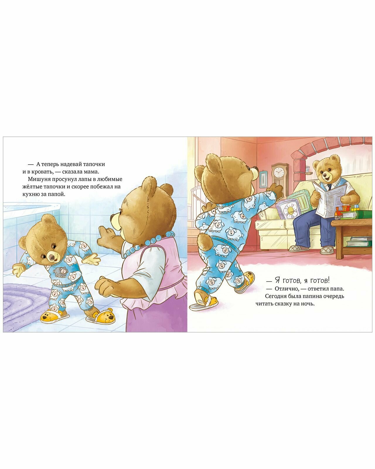 Мишуня маленький медвежонок, который, как и все малыши, любит играть и озорничать. А иногда может и покапризничать. Он станет для вашего ребёнка лучшим другом, с которым можно вместе радоваться, грустить и делать интересные открытия. Мишуня не хочет ложиться спать, хотя уже зевает. Но подготовка ко сну это так увлекательно! Нужно умыться и почистить зубы, не забыв скорчить рожицу своему отражению, а потом переодеться в пижамку. Дальше самое чудесное заснуть под добрую сказку на ночь. В детской так уютно, когда папа читает рядом!