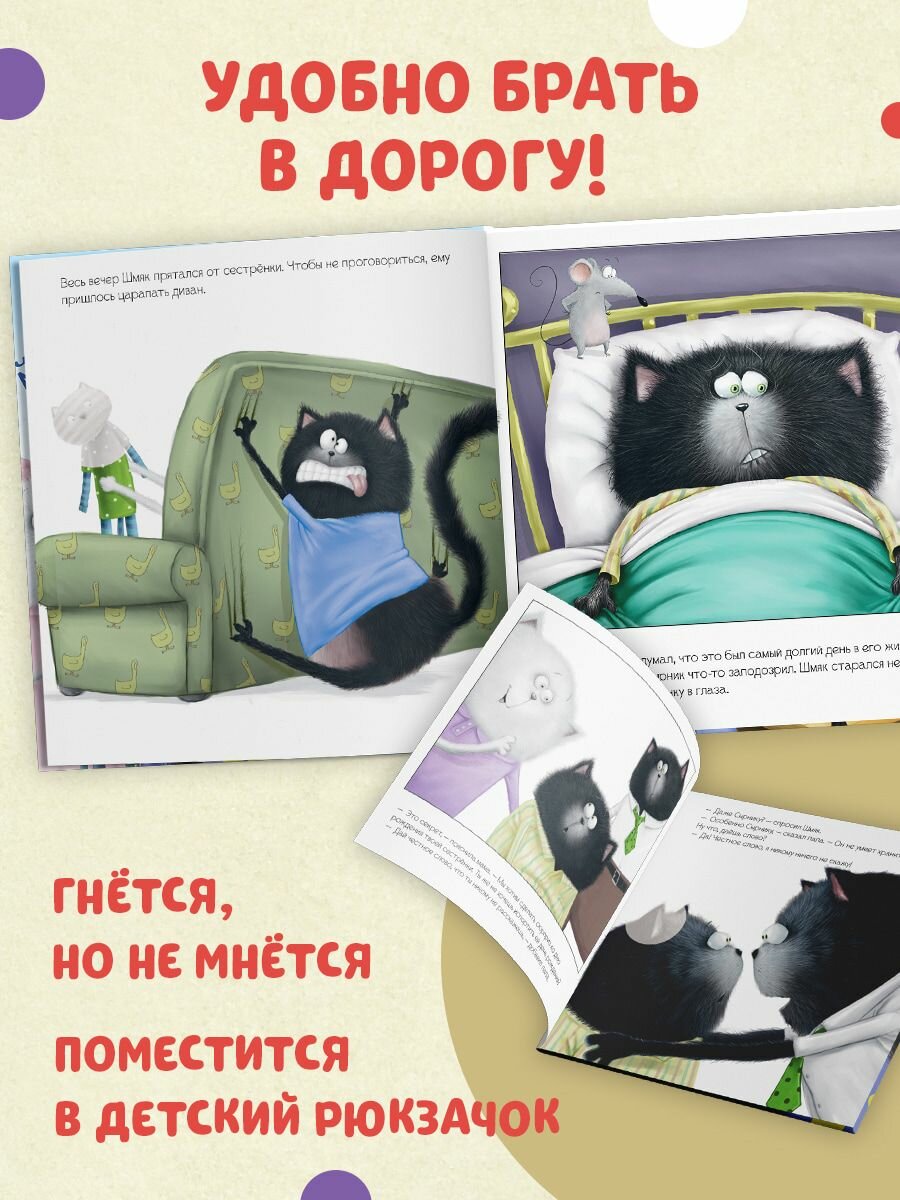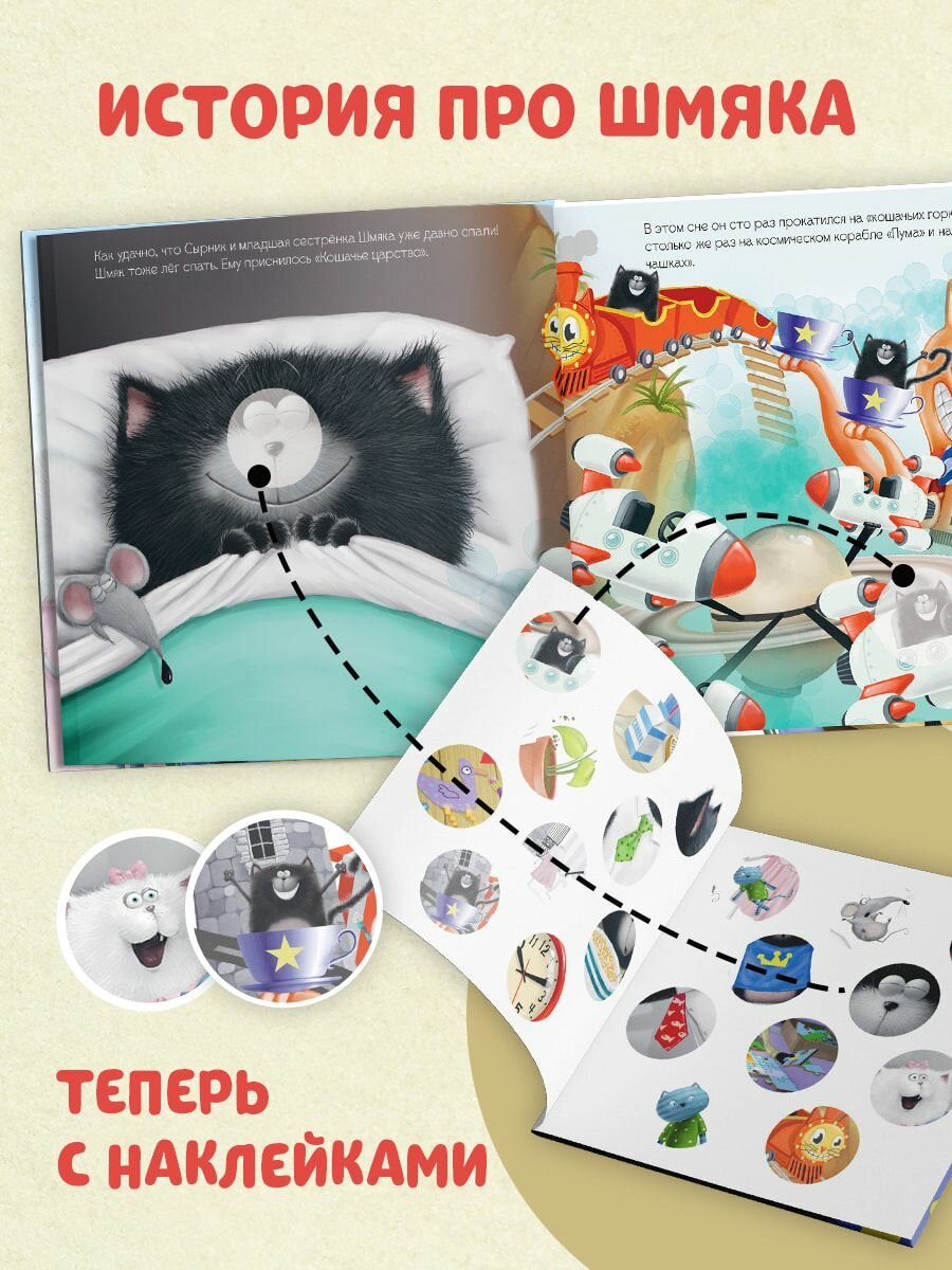 Роб Скоттон знаменитый художник и писатель, папа умилительного котёнка Шмяка, обожаемого детьми и родителями по всему миру. Котёнок Шмяк узнал, что мама и папа собираются устроить сюрприз для его сестрёнки на день рождения сводить всех в парк аттракционов «Кошачье царство». Родители попросили его сохранить тайну до выходных и никому не рассказывать. Сможет ли Шмяк сохранить секрет? Все дети обожают наклейки, поэтому мы добавили 20 СТИКЕРОВ, которые малыш должен разместить на страничках книги. ЧИТАЙТЕ, ПРОВОДИТЕ ВРЕМЯ ВМЕСТЕ И ВЕСЕЛИТЕСЬ!