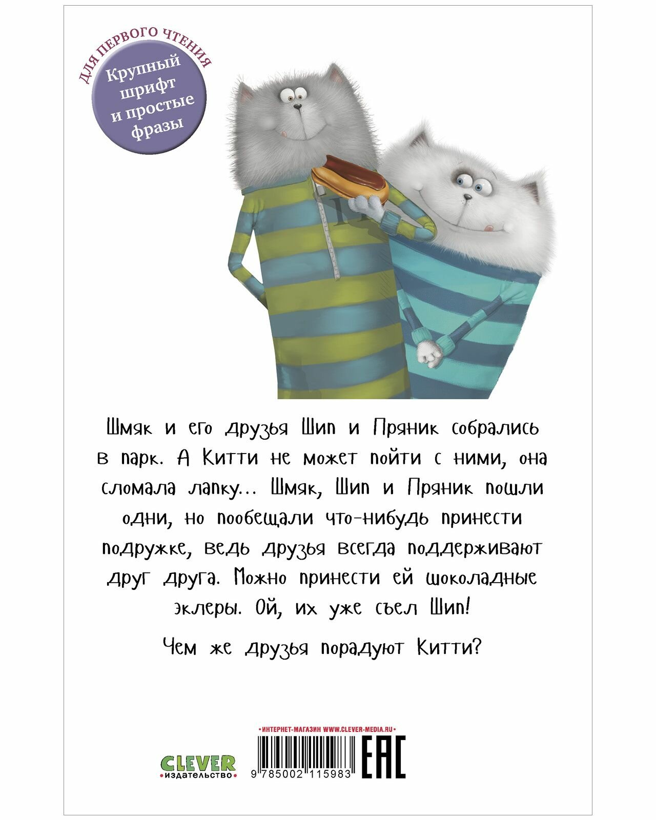 Шмяк и его друзья Шип и Пряник собрались в парк. А Китти не может пойти с ними, она сломала лапку Шмяк, Шип и Пряник пошли одни, но пообещали что-нибудь принести подружке, ведь друзья всегда поддерживают друг друга. Можно принести ей шоколадные эклеры. Ой, их уже съел Шип! Чем же друзья порадуют Китти?