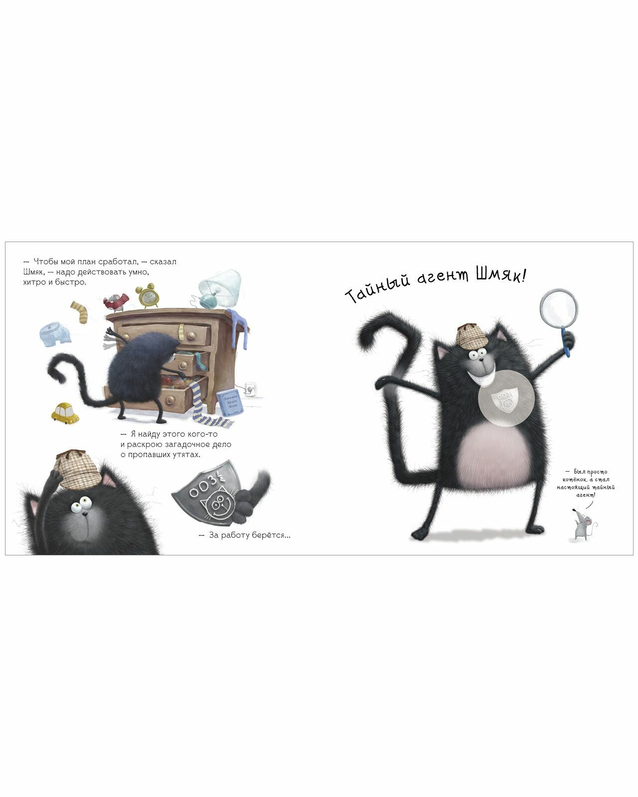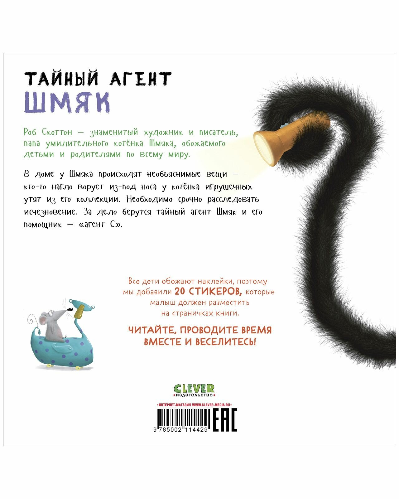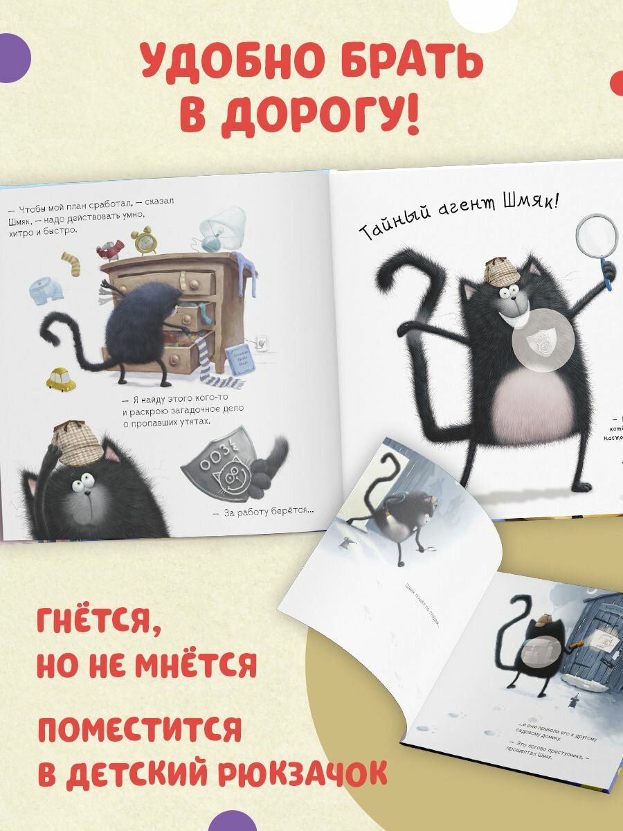 Роб Скоттон знаменитый художник и писатель, папа умилительного котёнка Шмяка, обожаемого детьми и родителями по всему миру. В доме у Шмяка происходят необъяснимые вещи кто-то нагло ворует из-под носа у котёнка игрушечных утят из его коллекции. Необходимо срочно расследовать исчезновение. За дело берутся тайный агент Шмяк и его помощник «агент С». Все дети обожают наклейки, поэтому мы добавили 20 СТИКЕРОВ, которые малыш должен разместить на страничках книги. ЧИТАЙТЕ, ПРОВОДИТЕ ВРЕМЯ ВМЕСТЕ И ВЕСЕЛИТЕСЬ!
