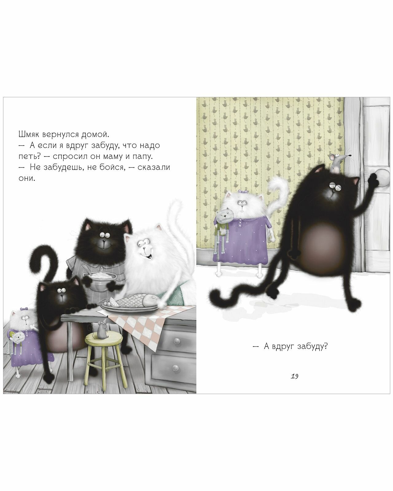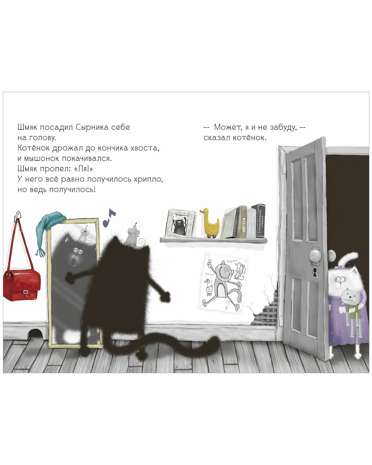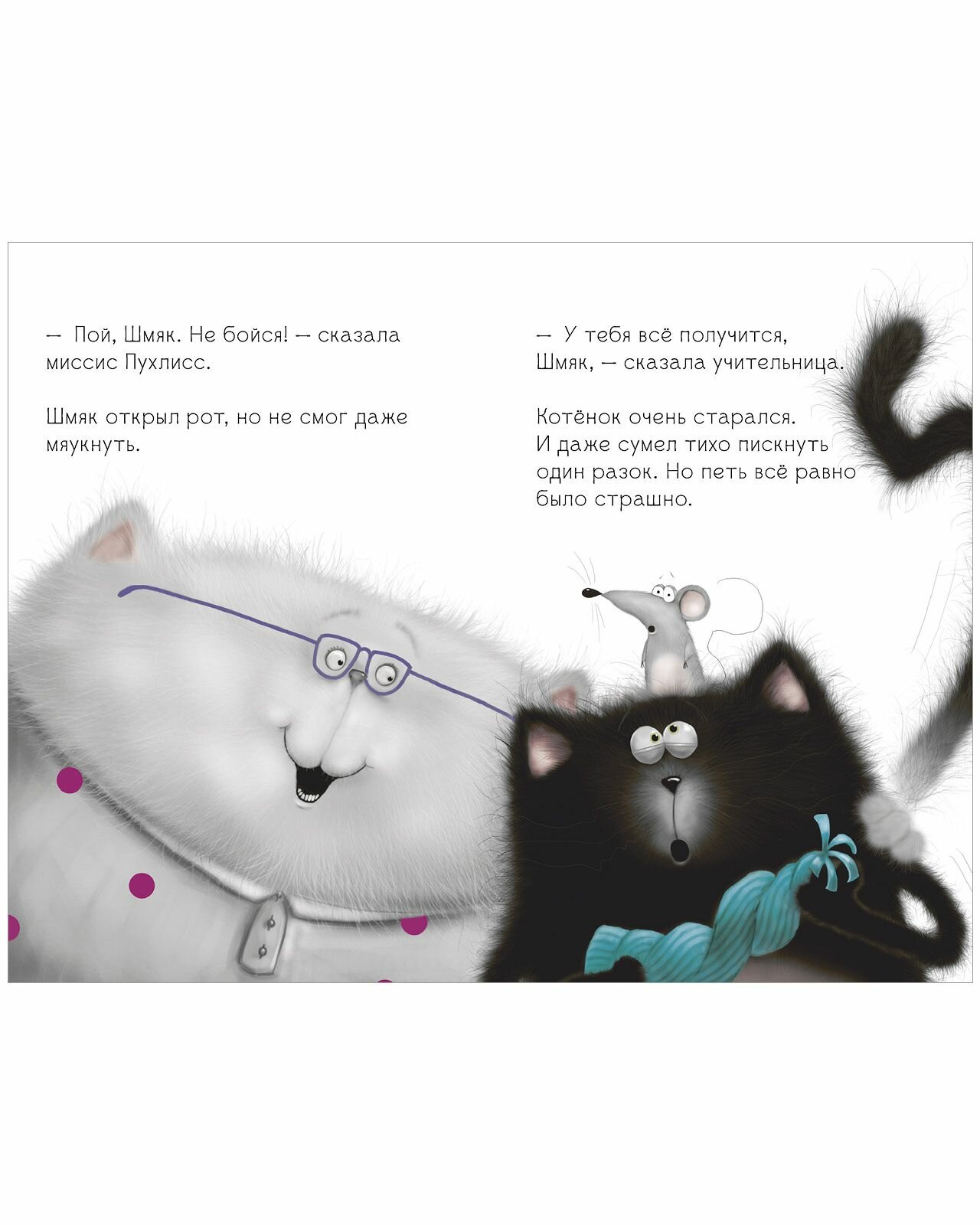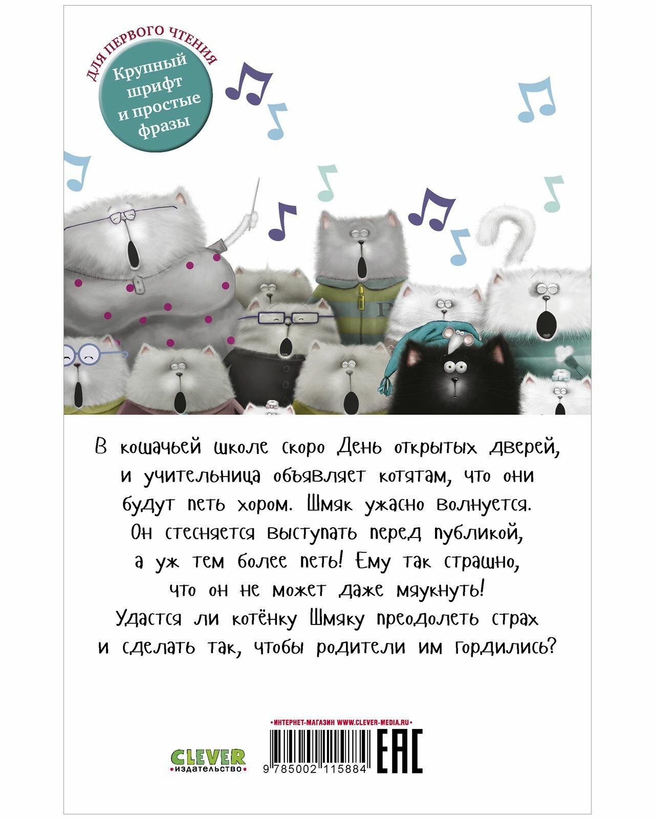 В кошачьей школе скоро День открытых дверей, и учительница объявляет котятам, что они будут петь хором. Шмяк ужасно волнуется. Он стесняется выступать перед публикой, а уж тем более петь! Ему так страшно, что он не может даже мяукнуть! Удастся ли котёнку Шмяку преодолеть страх и сделать так, чтобы родители им гордились?