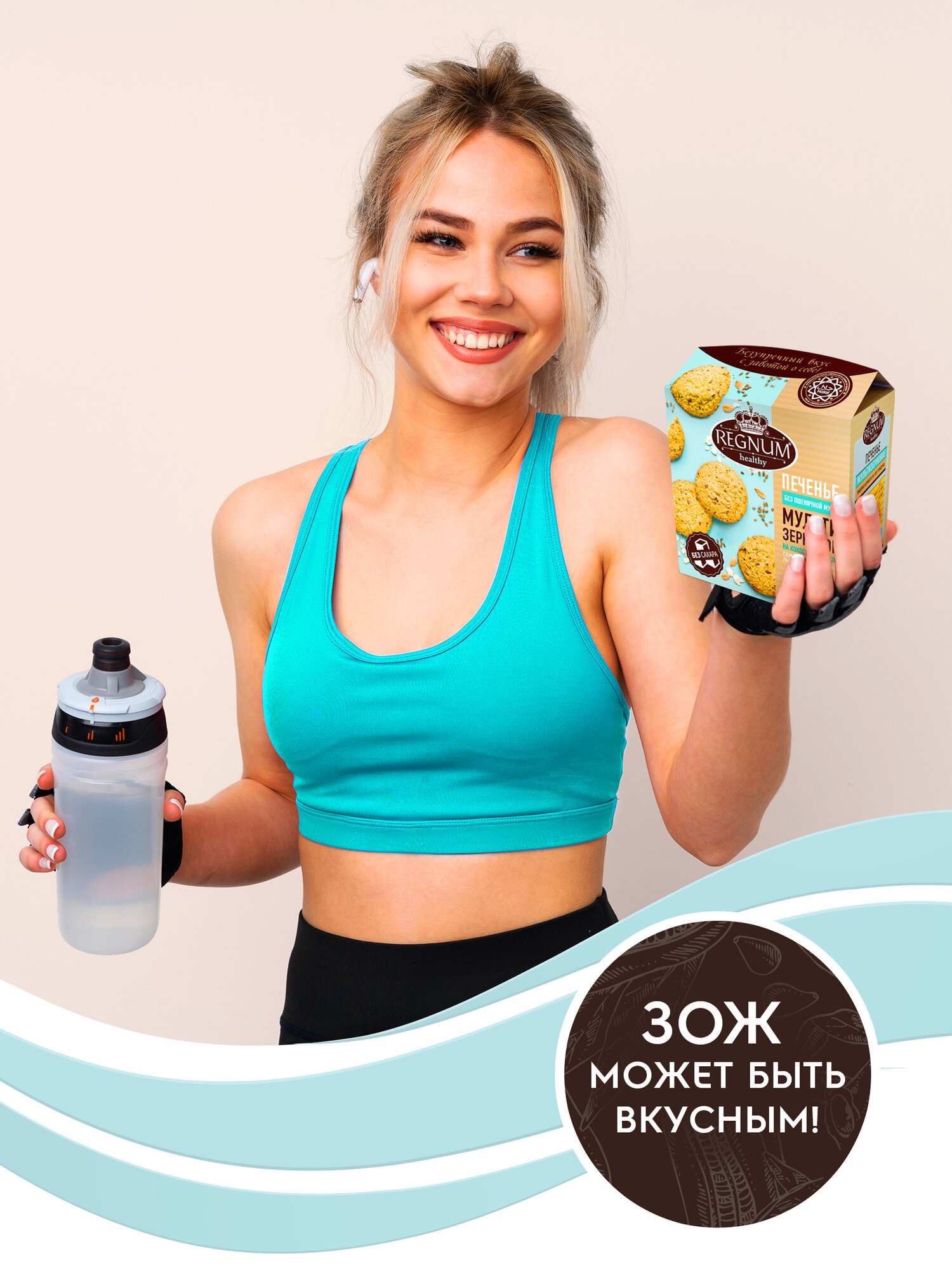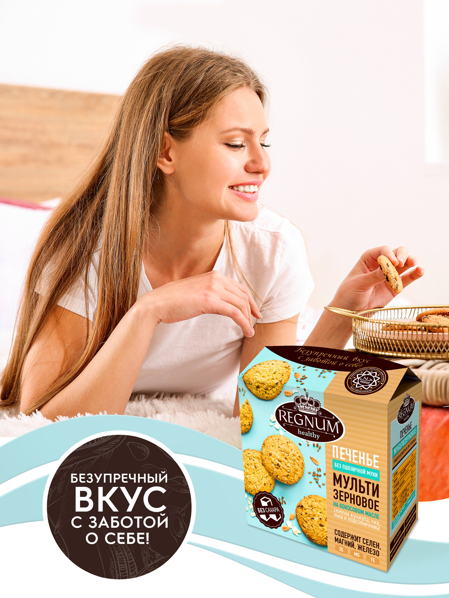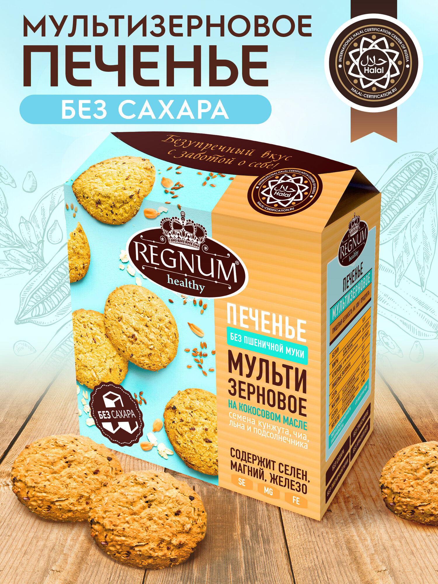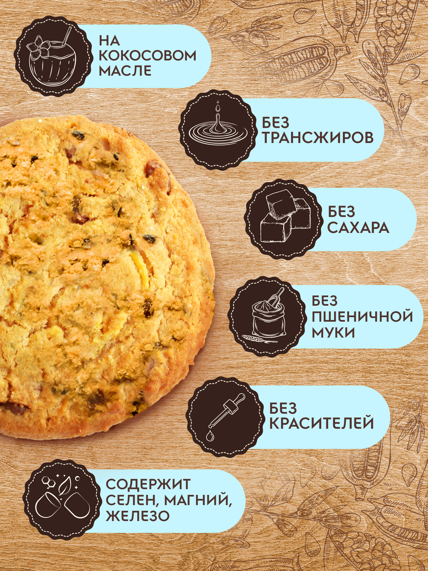 Вместо маргарина при производстве печенья используется настоящее кокосовое масло. В качестве подсластителя выбран мальтит: его калорийность и гликемический индекс ниже, чем у сахара. Кроме того, мальтит не вызывает кариес. Продукт обладает интересным вкусом и приятной текстурой, так как в его составе рисовая, кукурузная и овсяная мука, семена чиа, подсолнечника, льна и кунжута. Благодаря этом ингредиентам в печенье содержатся важные питательные элементы: селен, магний, железо.