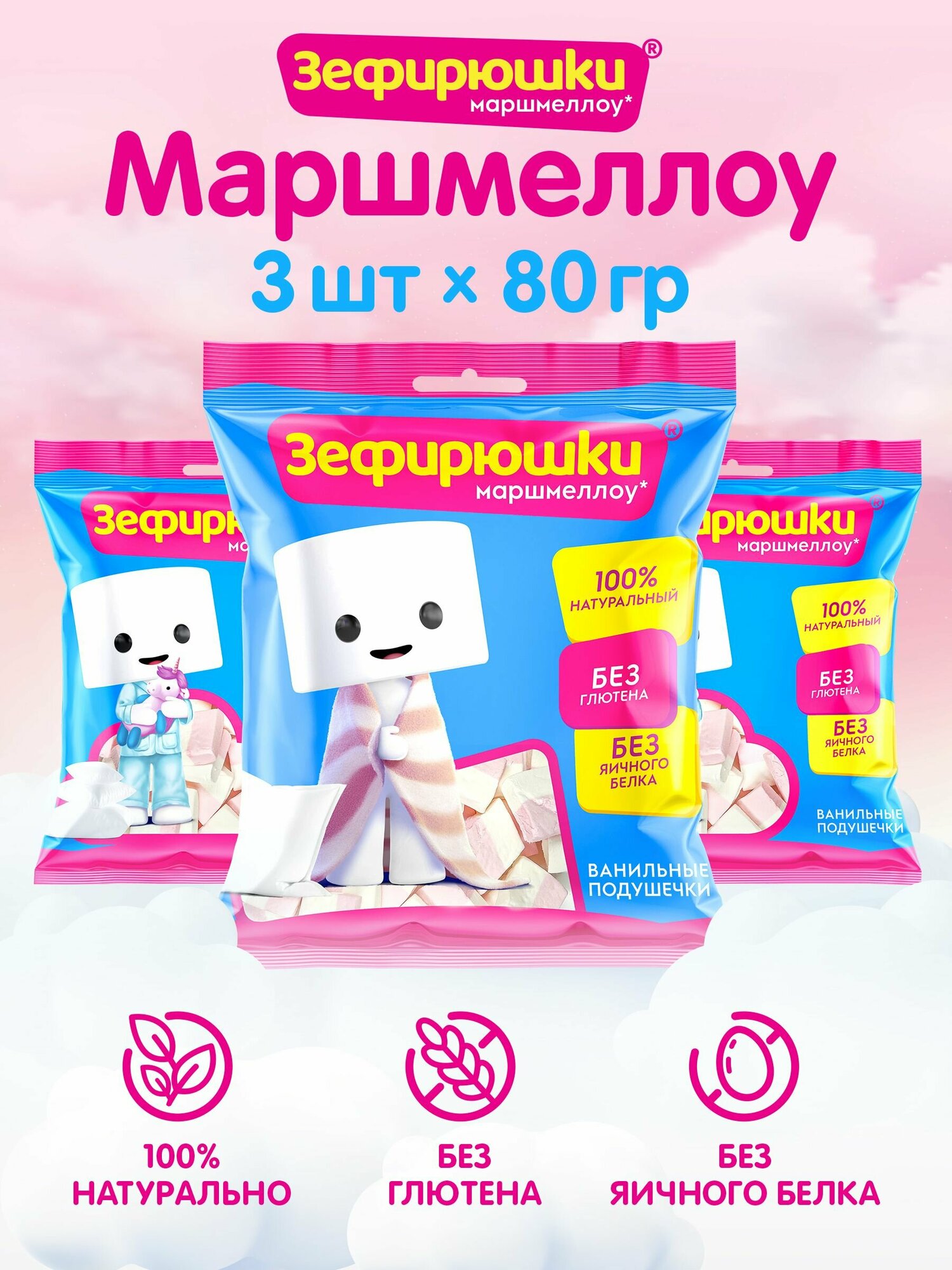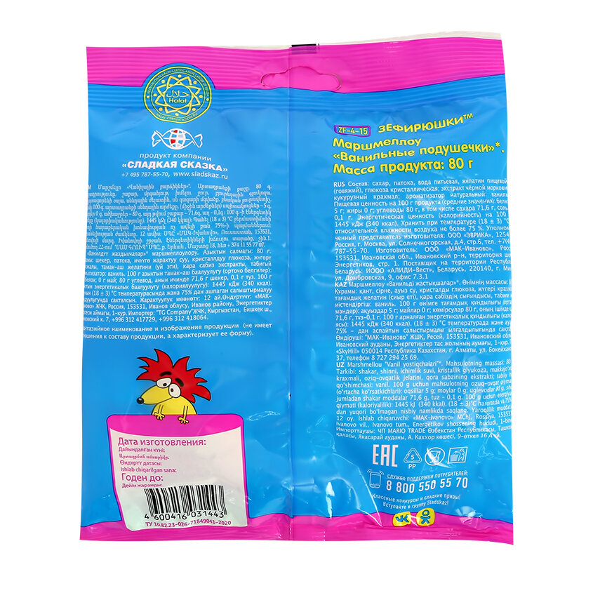 Сама нежность! Настоящий маршмеллоу в формате ванильных подушечек оценят дети и взрослые! Зефир отлично подойдет для украшения десертов, фруктовых салатов, дополнит декорт торта. А еще маршмеллоу очень вкусен сам по себе.Продукт не содержит глютен, поэтому подойдет людям, которые придерживаются безглютеновой диеты. Кроме того, в маршмеллоу нет яичного белка и фруктового пюре — продуктов, которые часто вызывают аллергиию.Внимание! Товар поставляется в ассортименте! Цвет/дизайн/вкус товара может отличаться от представленного на фото. Просим учитывать при формировании заказа отсуствие возможности выбора варианта данного товара.