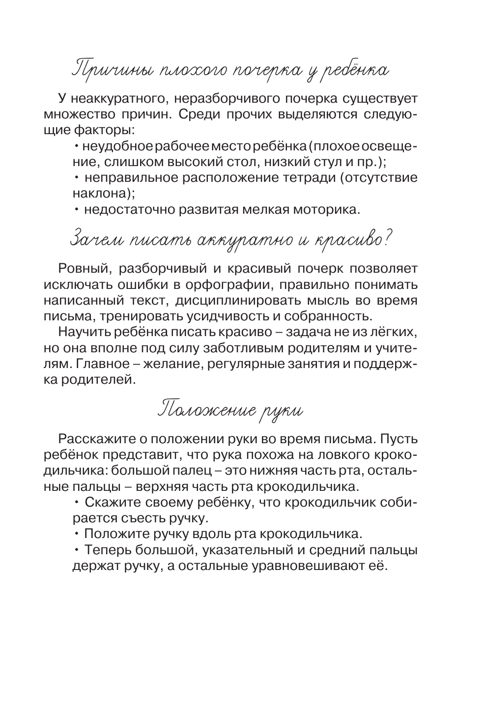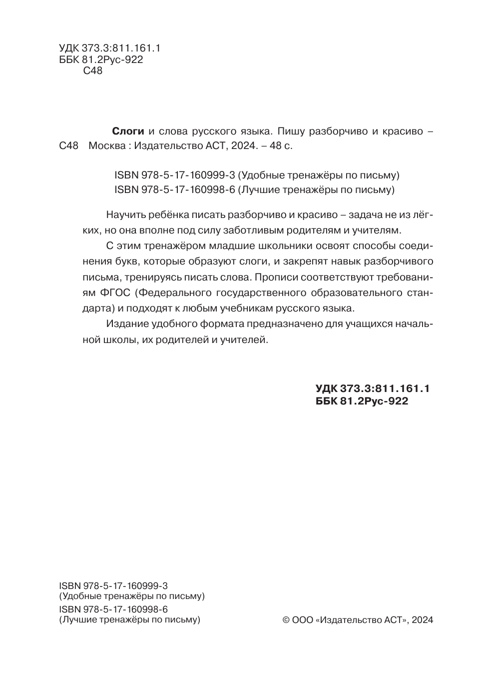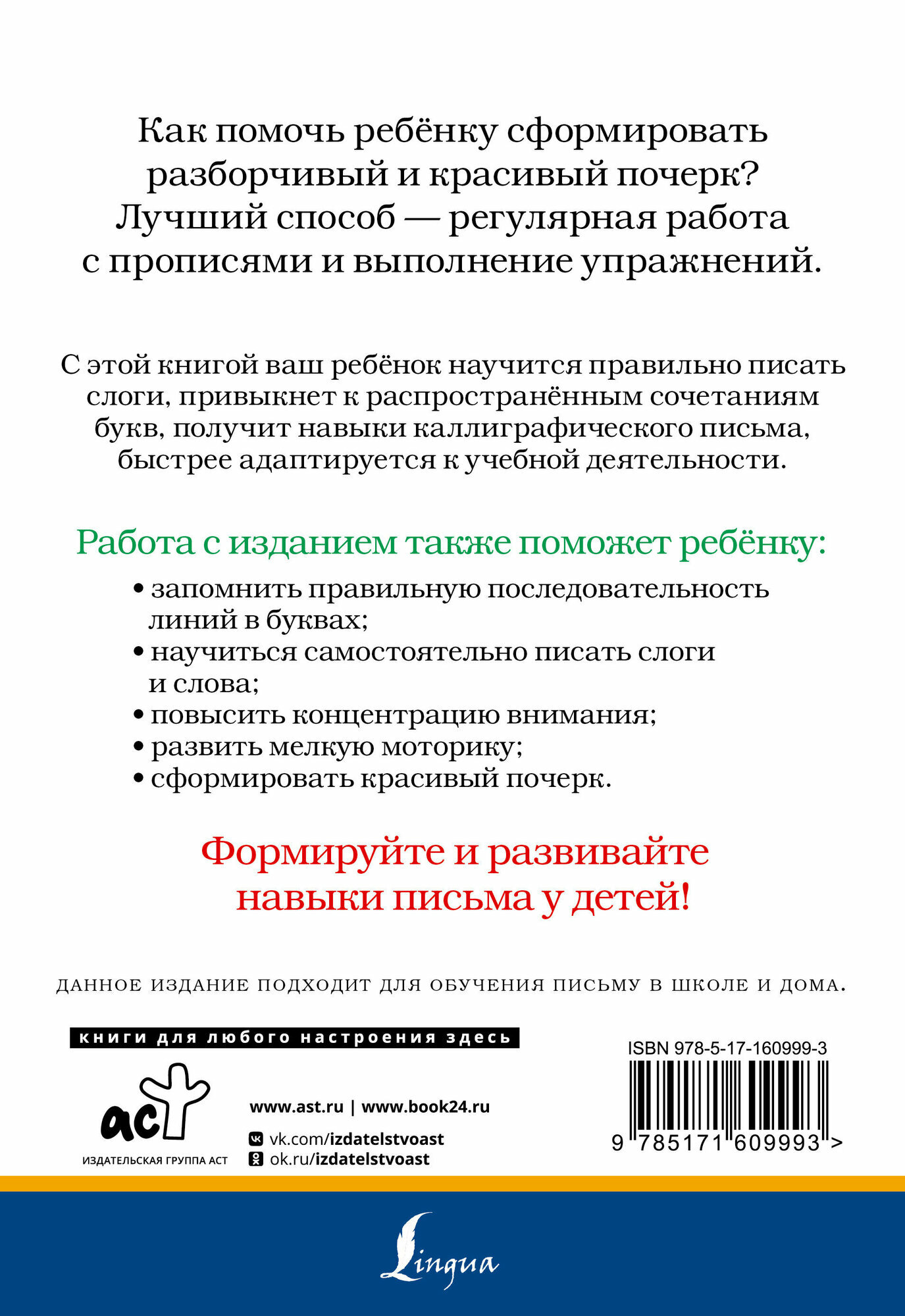 С этим тренажёром младшие школьники освоят способы соединения букв, которые образуют слоги, и закрепят навык разборчивого письма, тренируясь писать слова. Прописи соответствуют требованиям ФГОС (Федерального государственного образовательного стандарта) и подходят к любым учебникам русского языка.