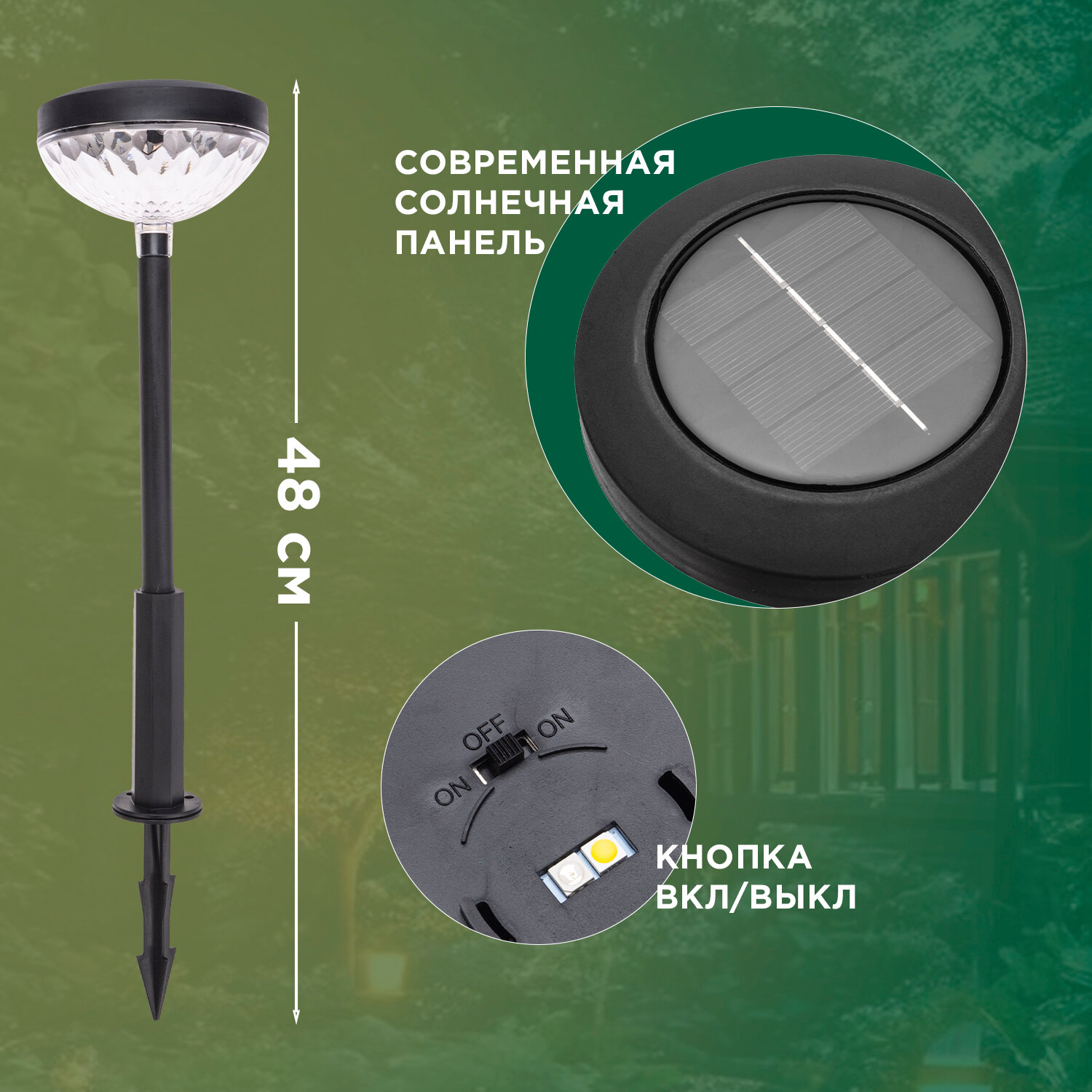Светильник оснащен солнечной панелью, которая поглощает солнечные лучи в течение дня и преобразует их в электрическую энергию.