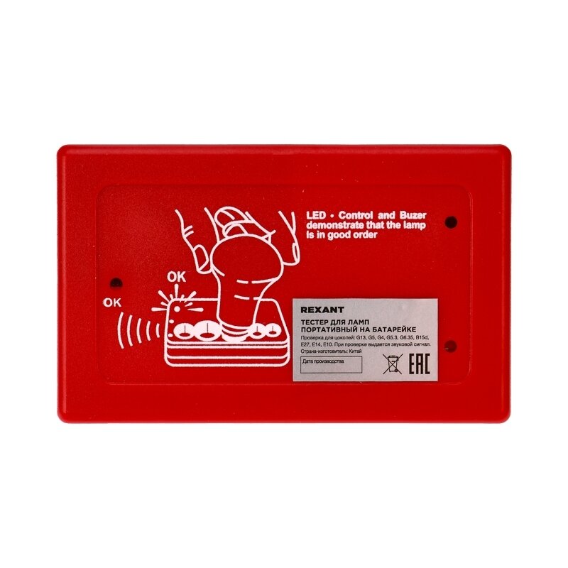 Тестер предназначен для проверки ламп c цоколем G13, G5, G4, G5.3, G6.35, B15d, E27, E14, E10. При проверке выдается звуковой сигнал. Работает от батареек «Крона» 6LR61 (9 В) – в комплект не входит. При неисправности лампы срабатывает звуковой сигнал, что облегчает работу и обеспечивает безопасность.